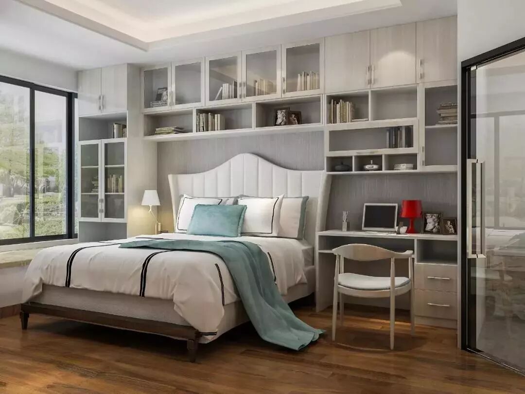 也可以利用床头柜空间,单独设计办公桌和书架,让每一寸空间都发挥应有的作用。在有限的卧室空间里完成多种功能,满足生活需求。