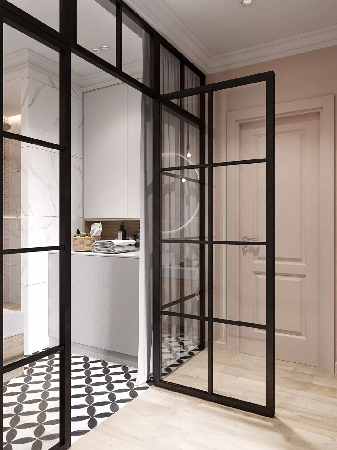 平时如厕后,空气中含有大量细菌,选择能自动关的隐形门,不仅能防止卫生间的细菌、异味扩散到家里每个角落,还能化解入户门正对卫生间的尴尬和不利。
