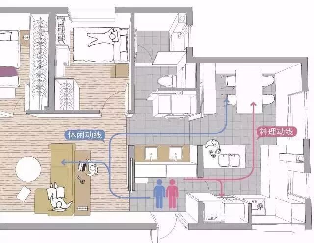 动线是人们完成某一系列动作而走的路线。比如进门动线,先经过门厅之后才能进入客厅,在空间里所走的每一步,都属于动线。