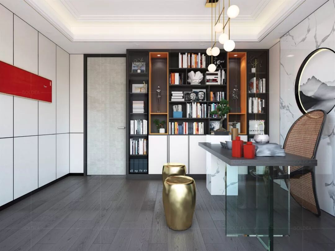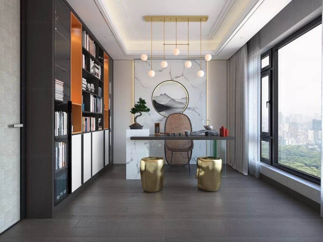 书房空间少去了繁复的雕刻花纹,融入线条的写意,让整个空间带有一种中式的美感。融入天圆地方的概念,以一种特别的方式展现出独有的干净利落。
