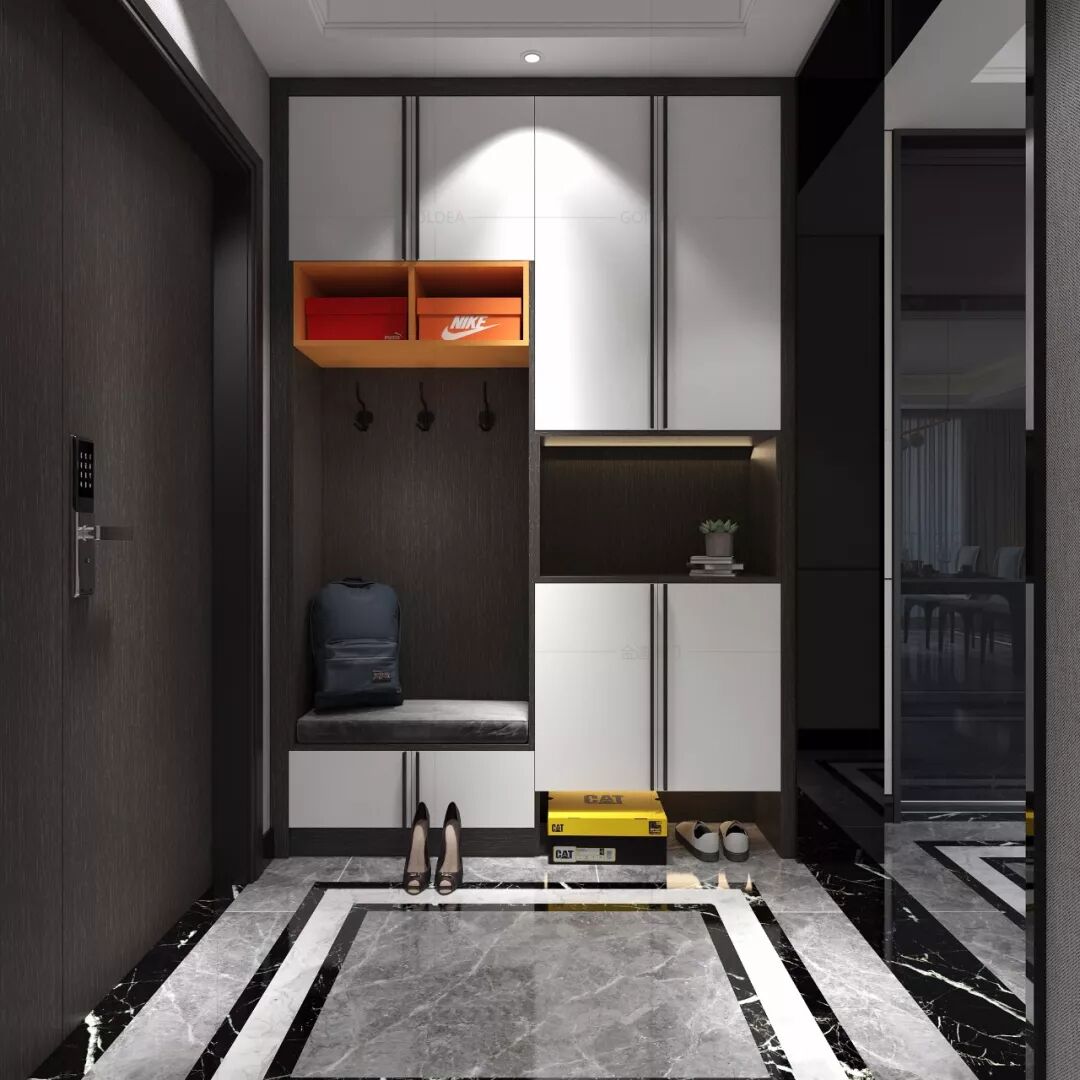 高光枫影铝木门与皮纹米白的轻奢背景墙的结合让整个过道空间呈现统一又有格调感。