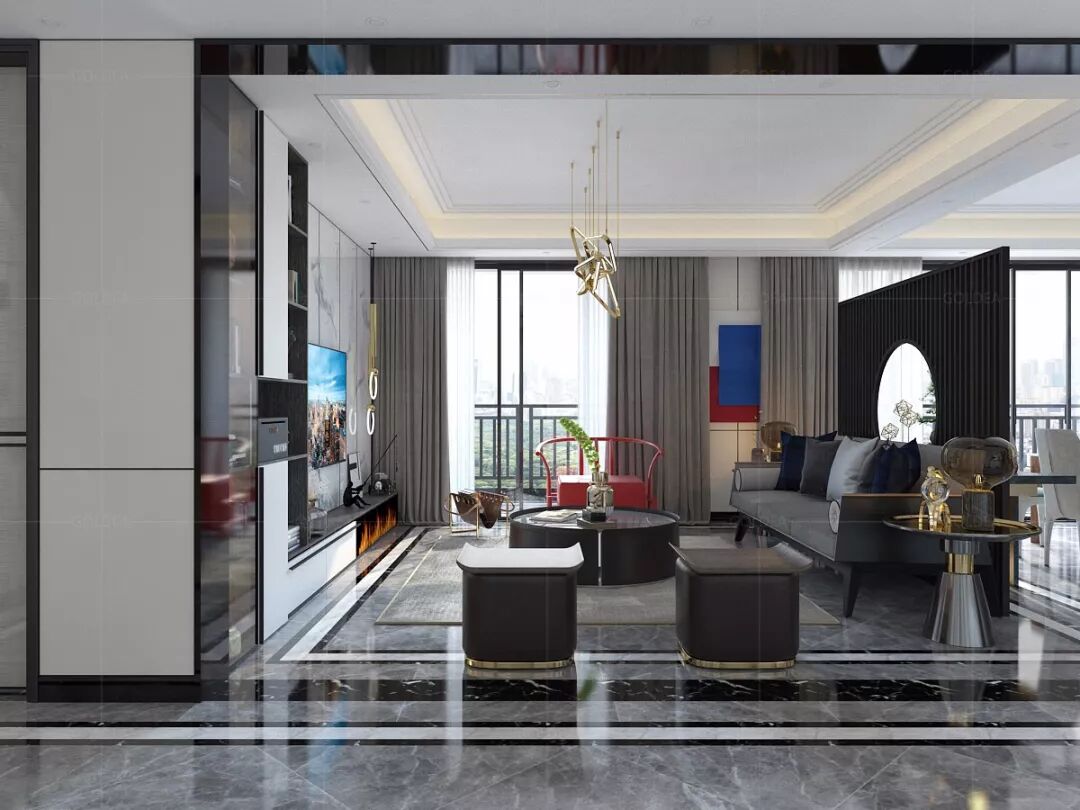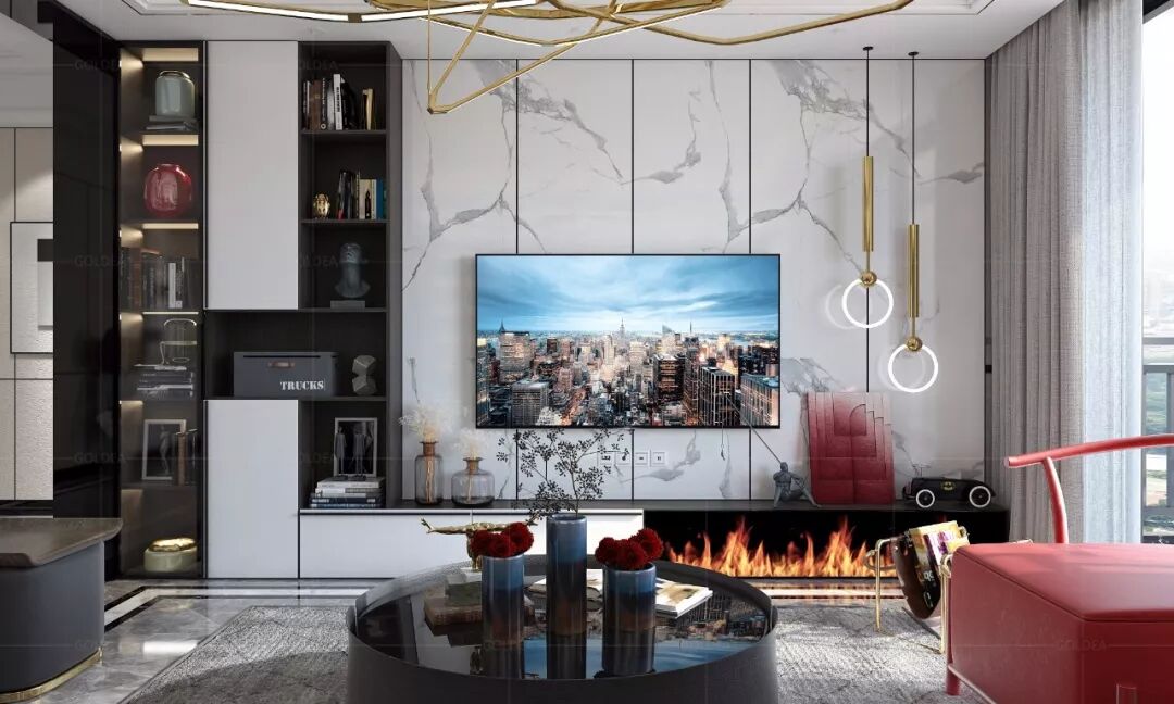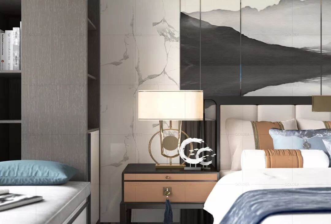 金属材质背景墙配搭着的中花白大理石材质质感饰面,又带着现代设计的时尚,创新出富有格调的品味。