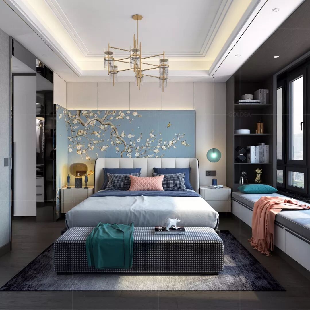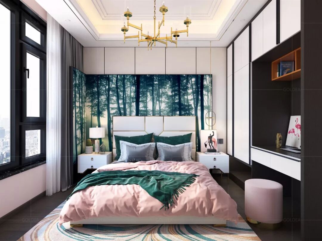 灰蓝色的柔情与飘逸的窗帘,床背景墙以大幅墨绿色森林作为主题给人有种挪威森林之感。