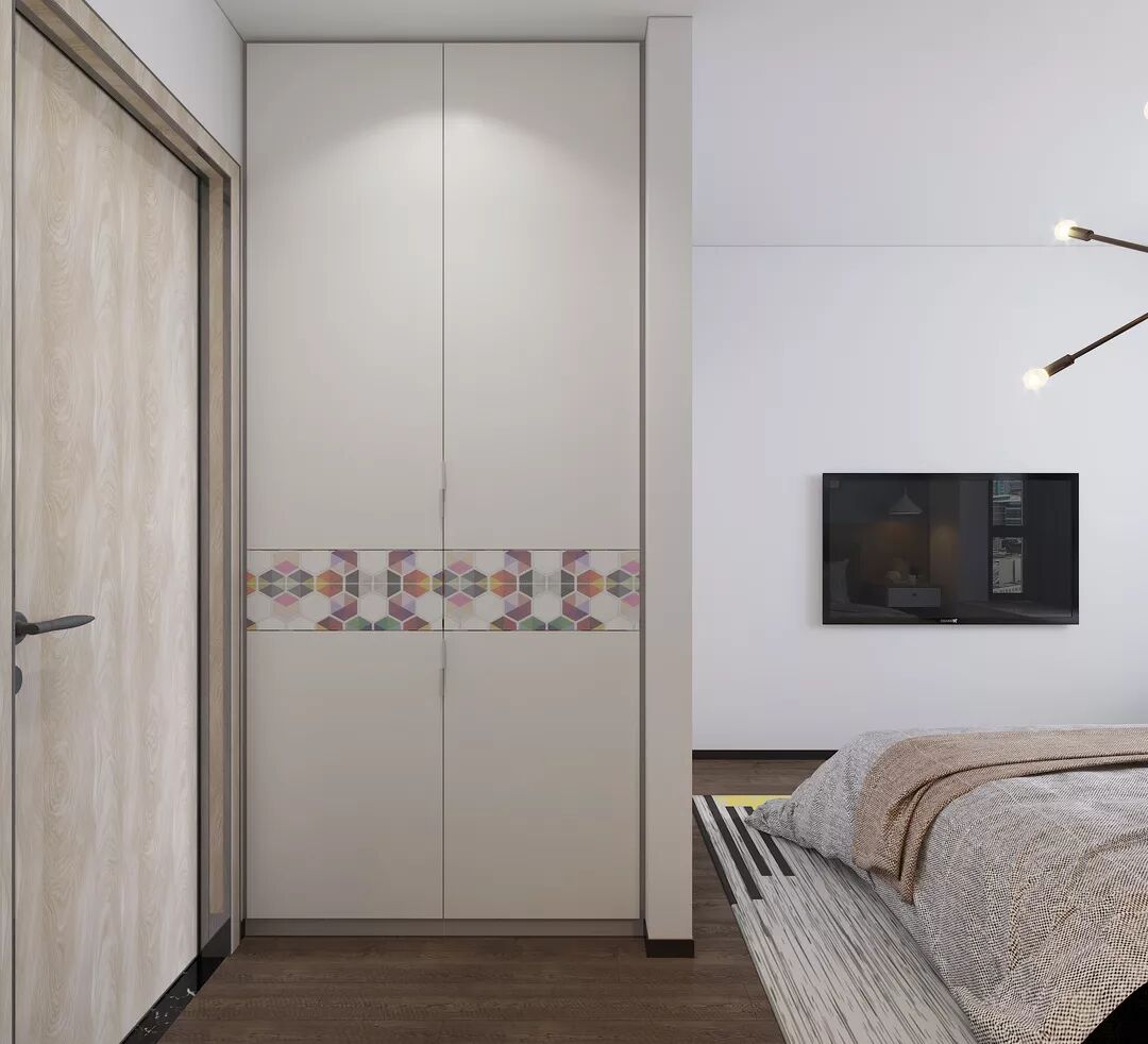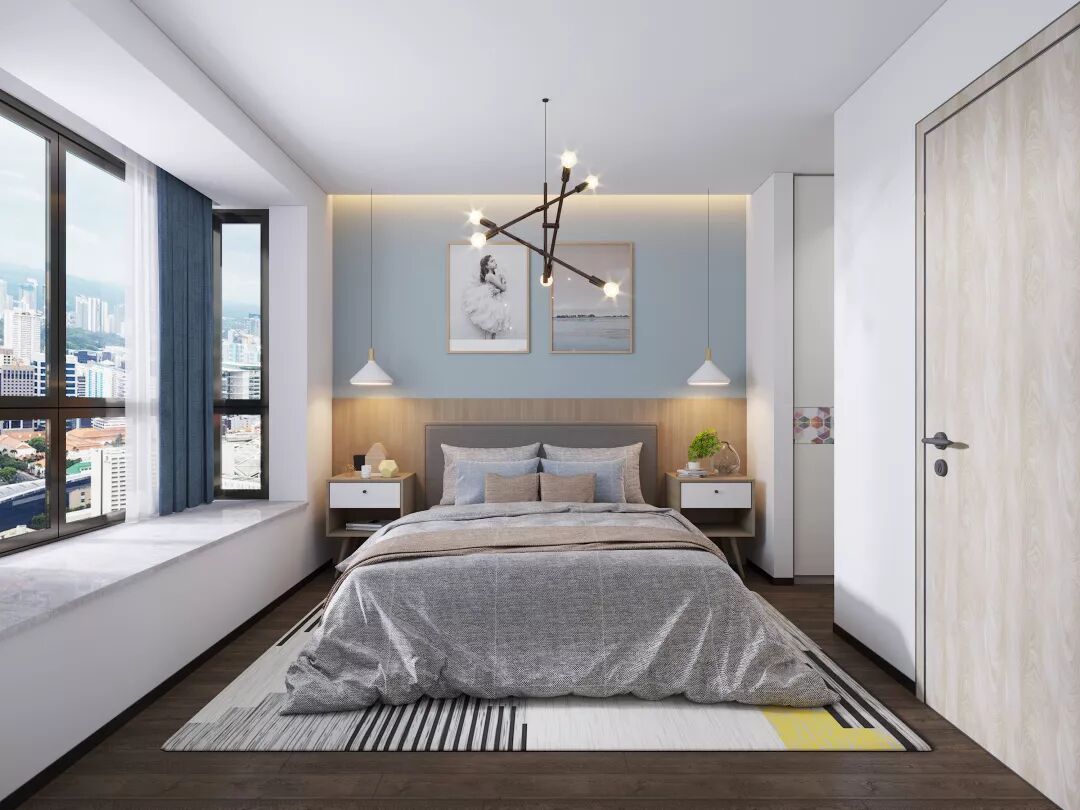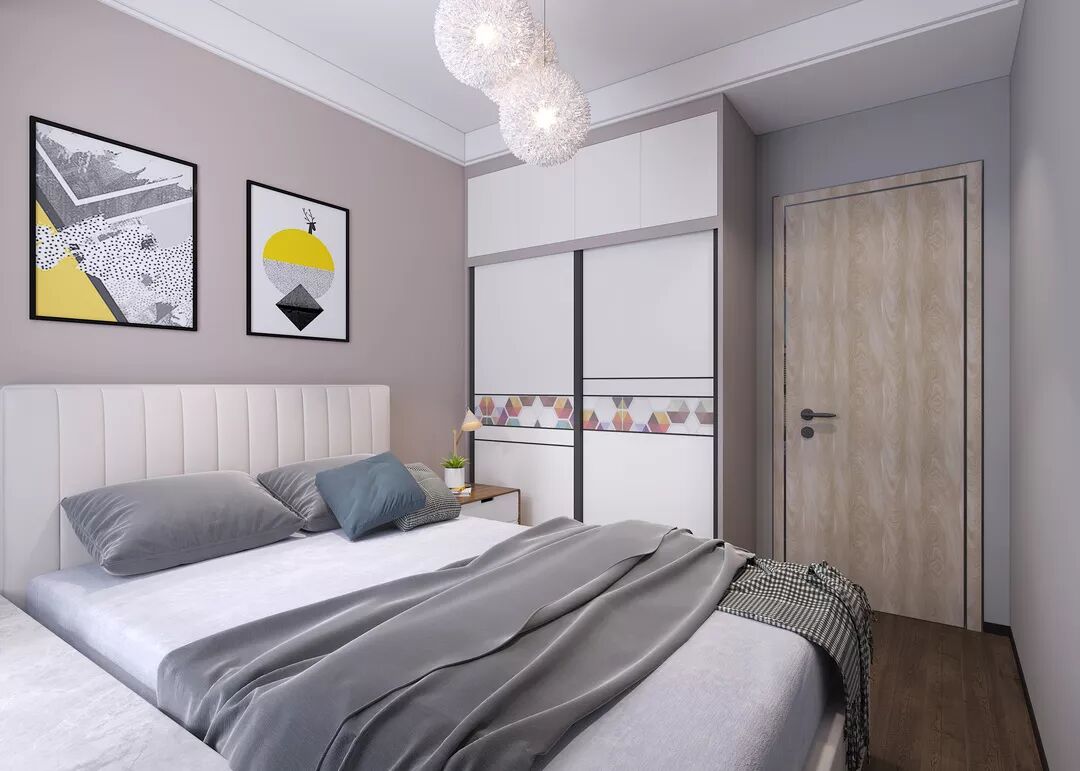 主卧的设计时尚气息非常浓,富有设计感的吊灯和性冷淡风的床被,都有一种T台秀的高级感。利用走道两侧内嵌衣柜,巧妙地利用空间构造,用欢欣的纯白与多彩的立方体定格,让卧室也更加有设计感。