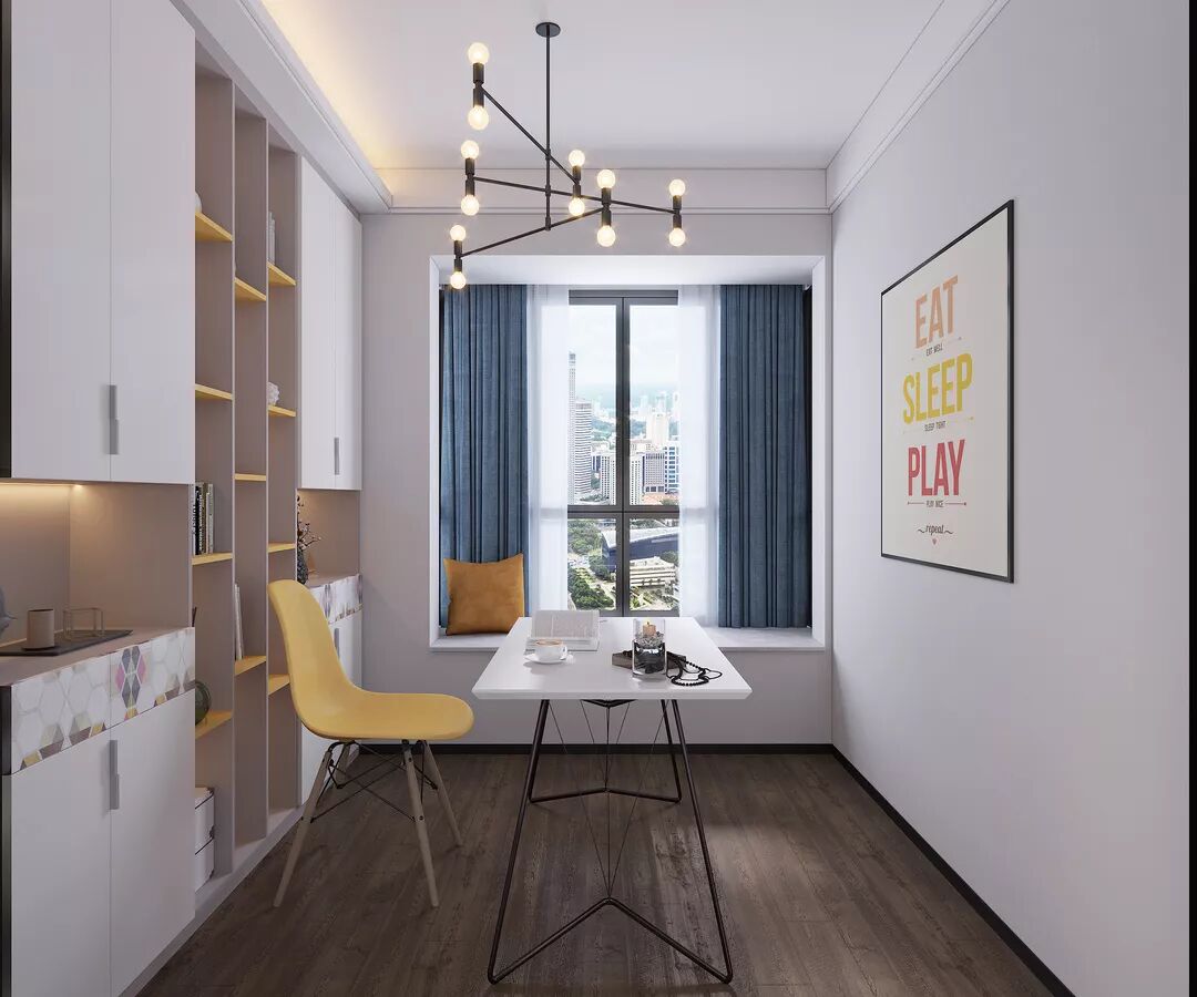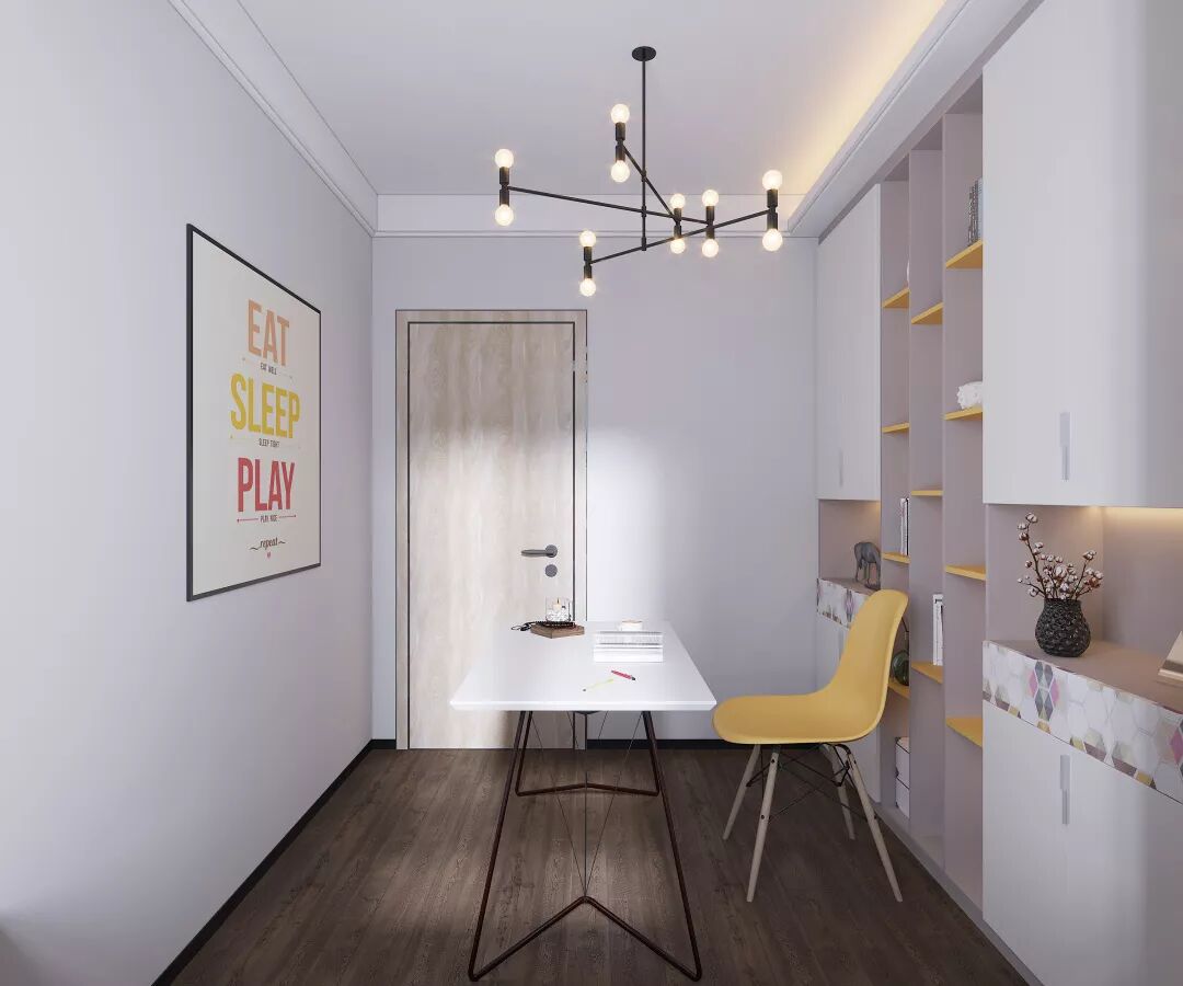 书房需要静谧,但是这个书房这么现代化的设计还带有使人上进的感觉,墙画和书柜都特别容易使人干劲十足,学习中潜移默化带入上进心理。