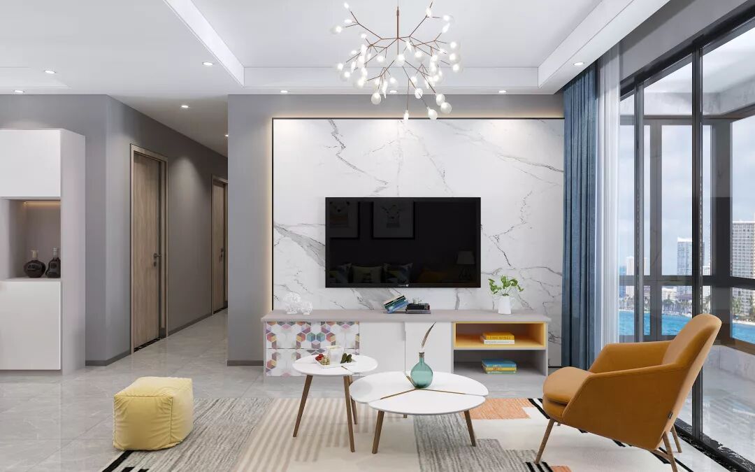 大理石墙面带着高级的视觉感,融入简约又时尚的家居,缤纷拼图花色在空间中显得活泼灵动。电视柜不做复杂,干净的柜面,设计简单的收纳空间,让客厅保持整洁舒服。