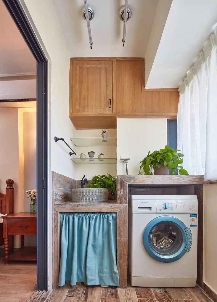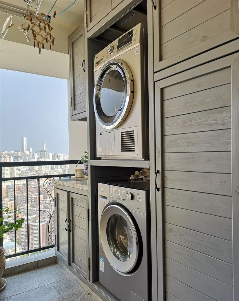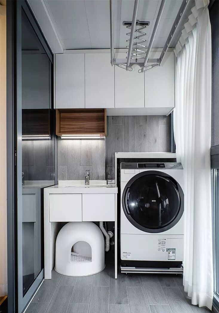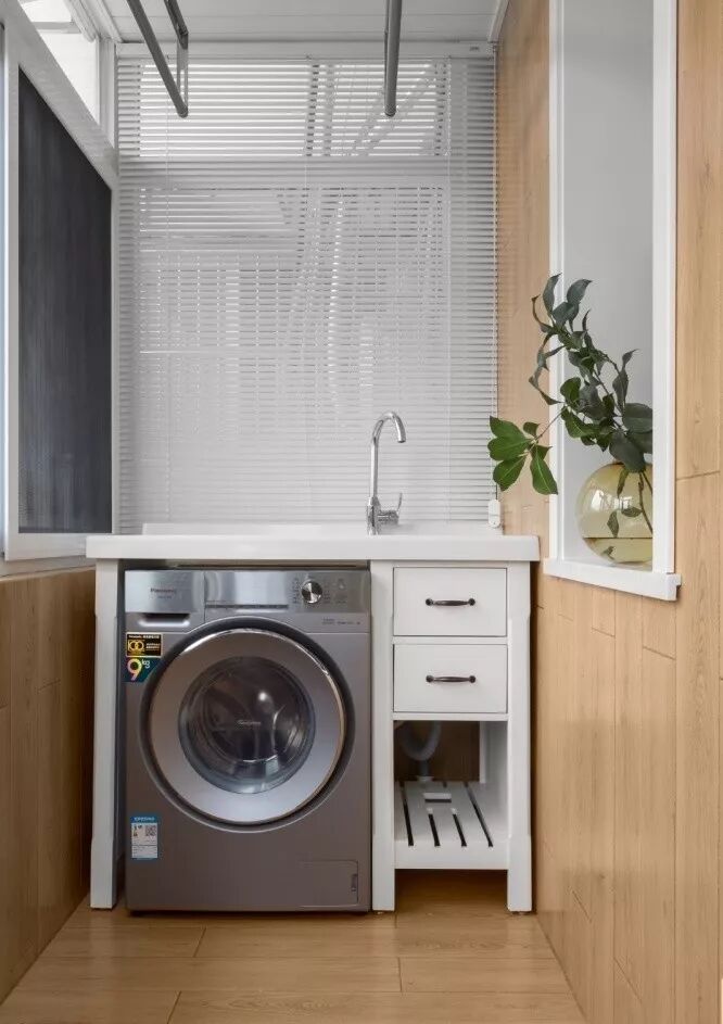 如果解决了下水问题,阳台简直是洗衣机的天堂,可以分分钟布置出一个家务区。