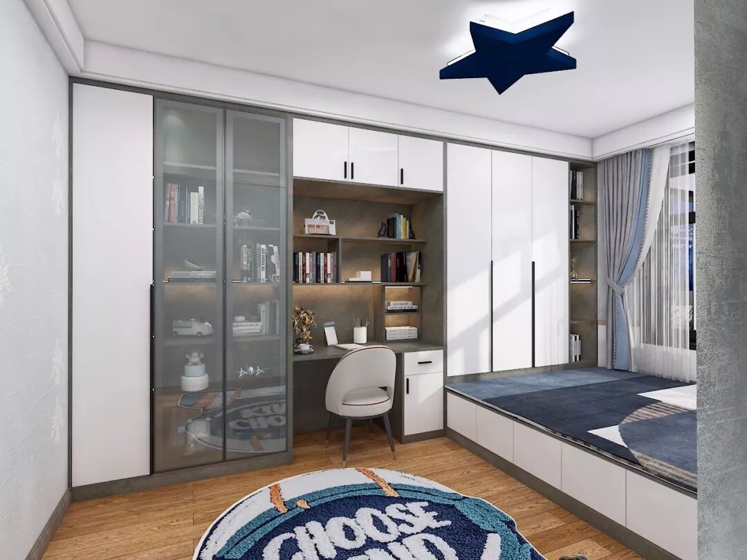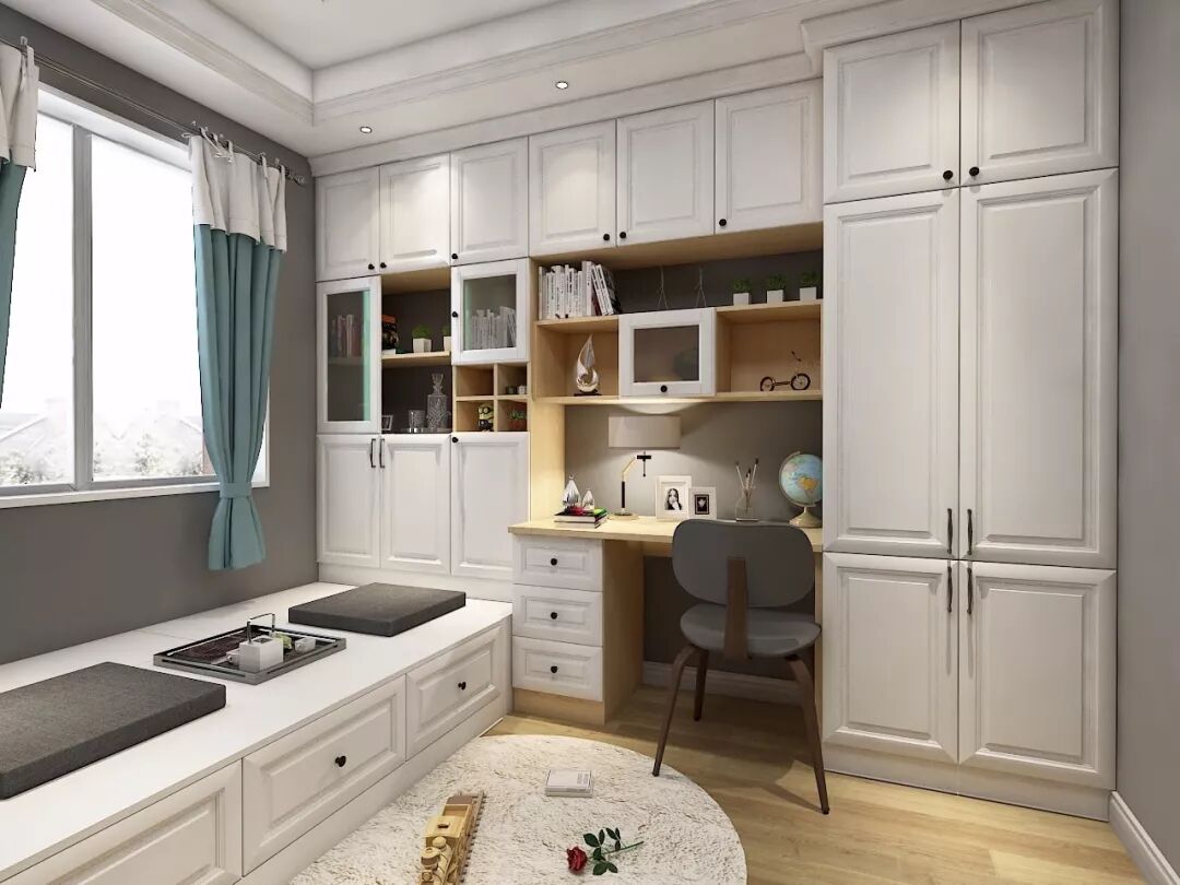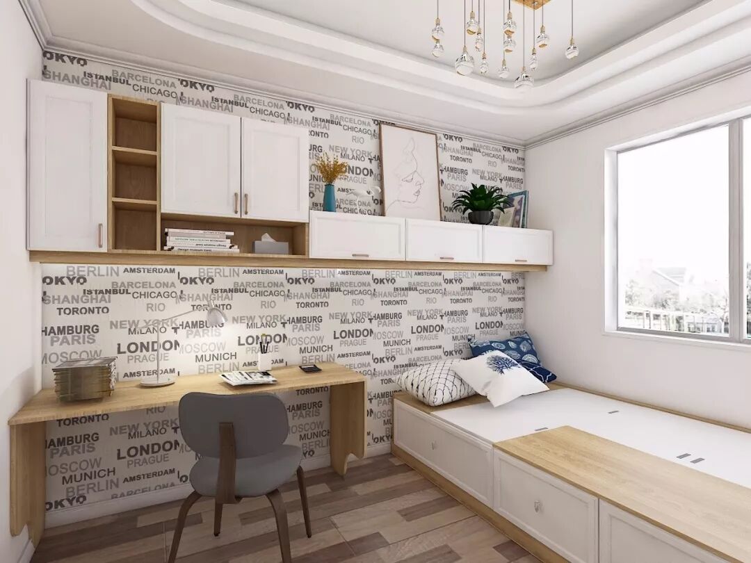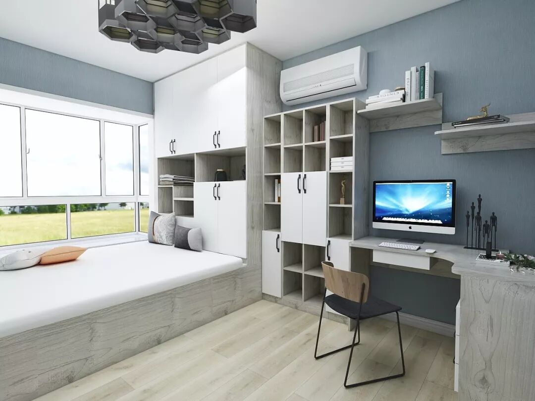结合户型和采光来判断书桌的朝向以后,你就可以确定将组合式柜体放在床头还是床尾。L型的布局方式可以更好地完成衣物、书籍和零碎物品的收纳,还能提高整体空间的利用率,塑造简洁干净的空间感。