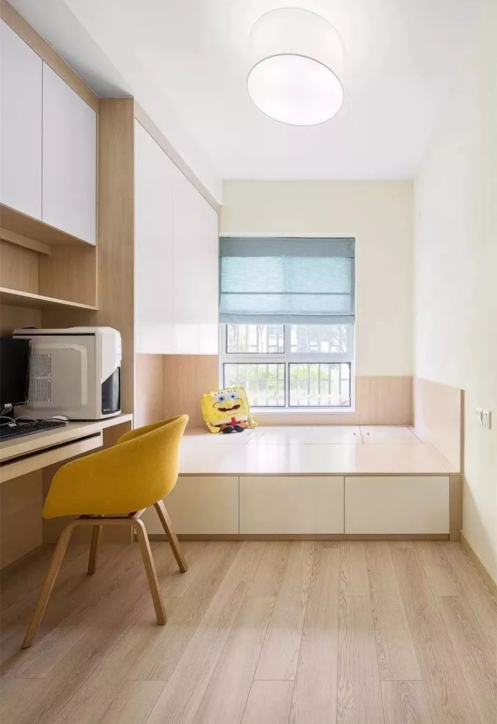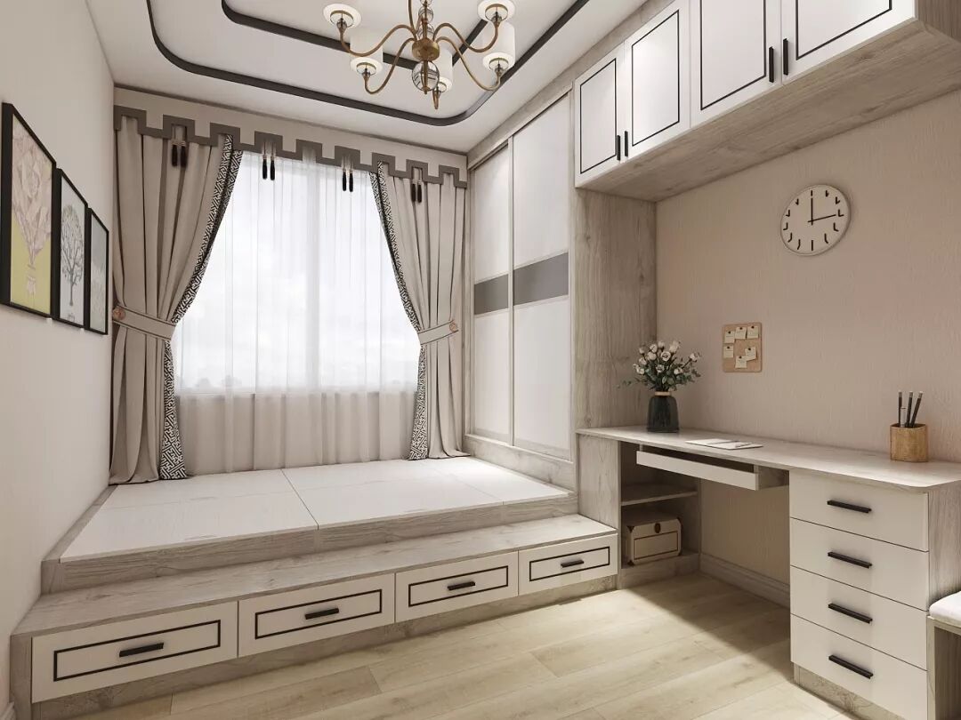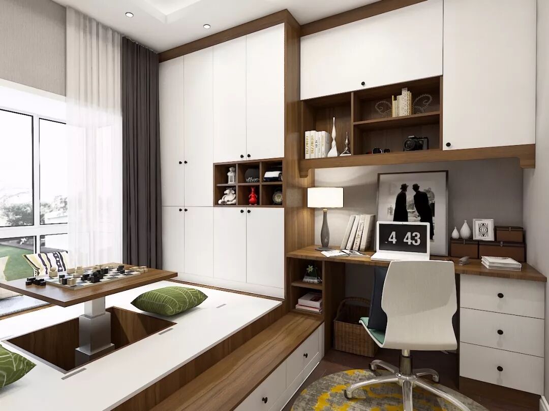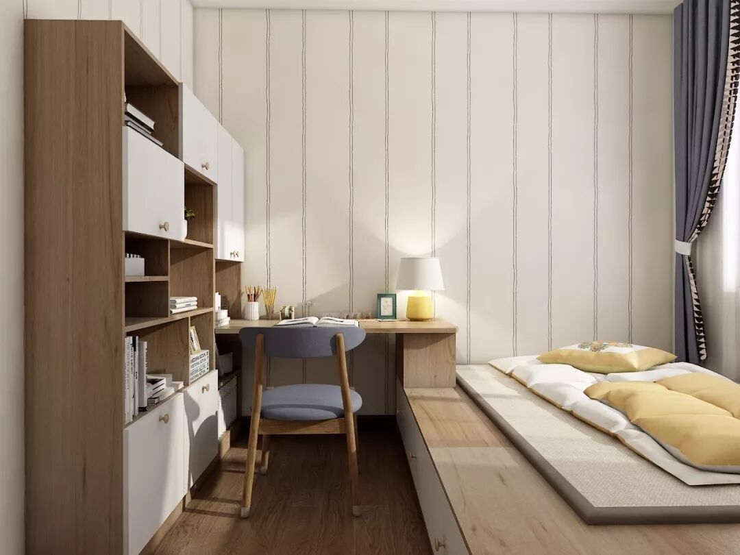 一个超级实用的榻榻米空间,可以结合靠墙而立的定制柜体,来提高整个房间的收纳机能,达到“一房多用”的目的。
