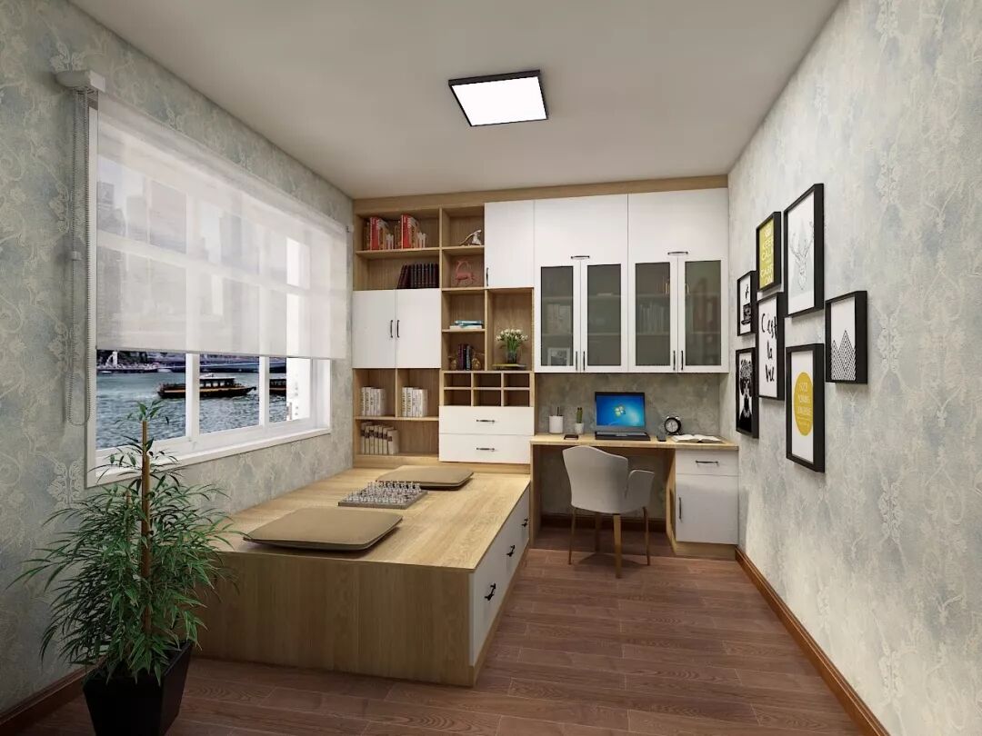 如果因户型面积受限,无法拥有一间独立书房的话,可以把榻榻米空间打造成一个小型书房,更能展现一分恬静的感觉。