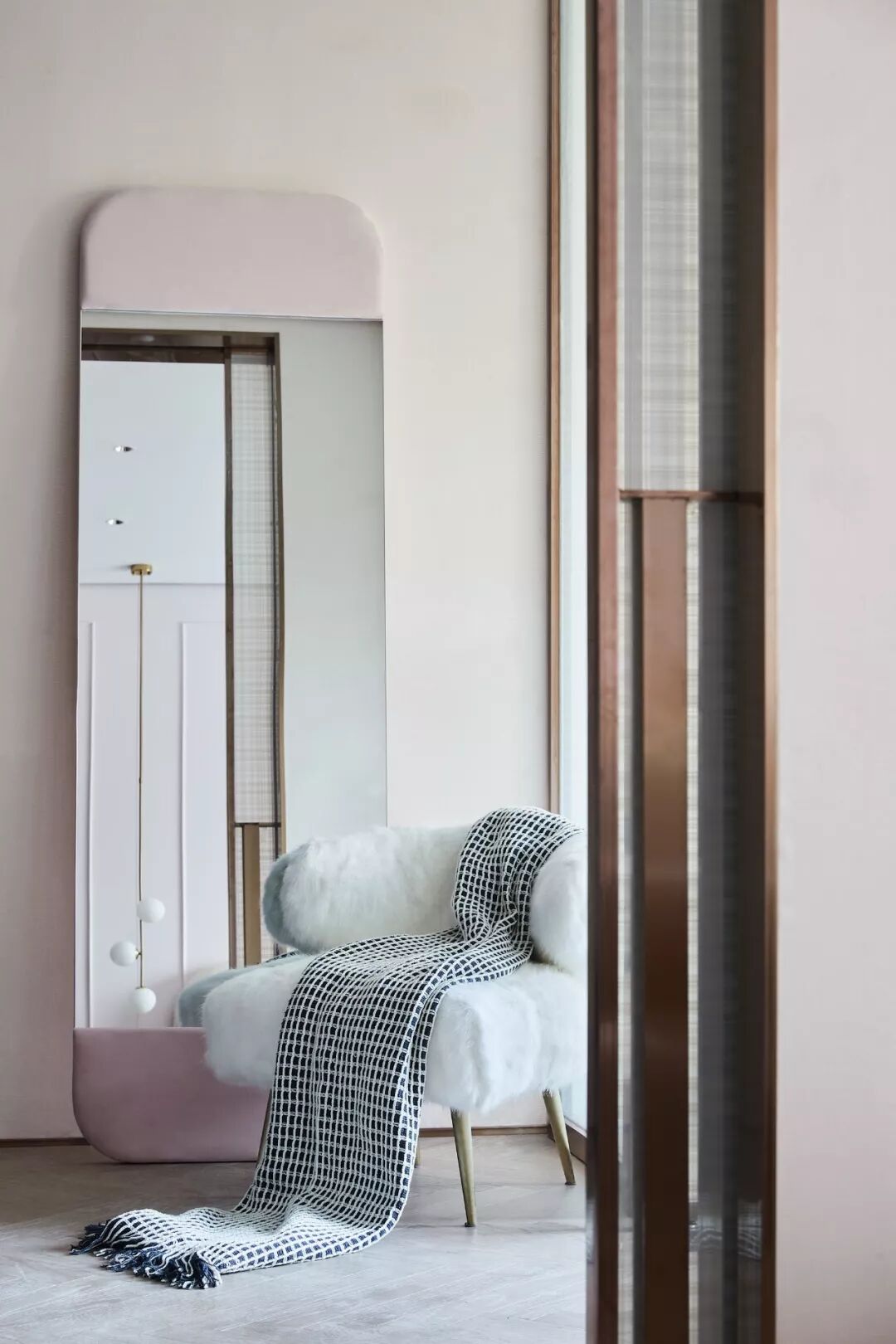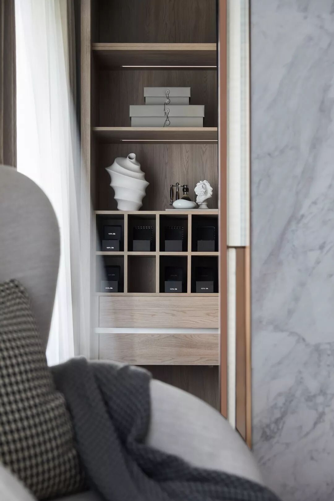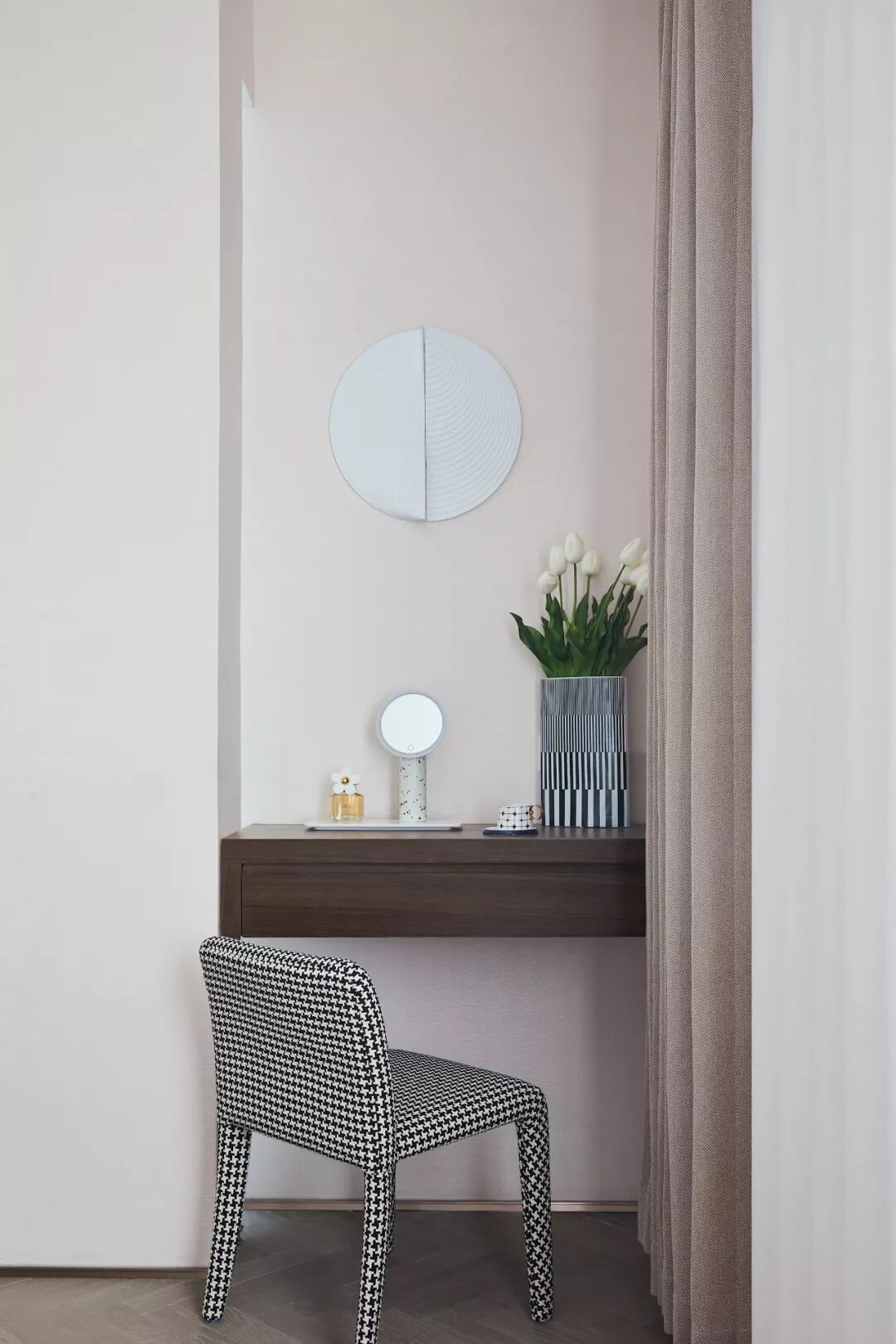 梳妆台左侧破除常规,经由一块竖向玻璃与卫浴室隔断,让这一隅饶有情趣。