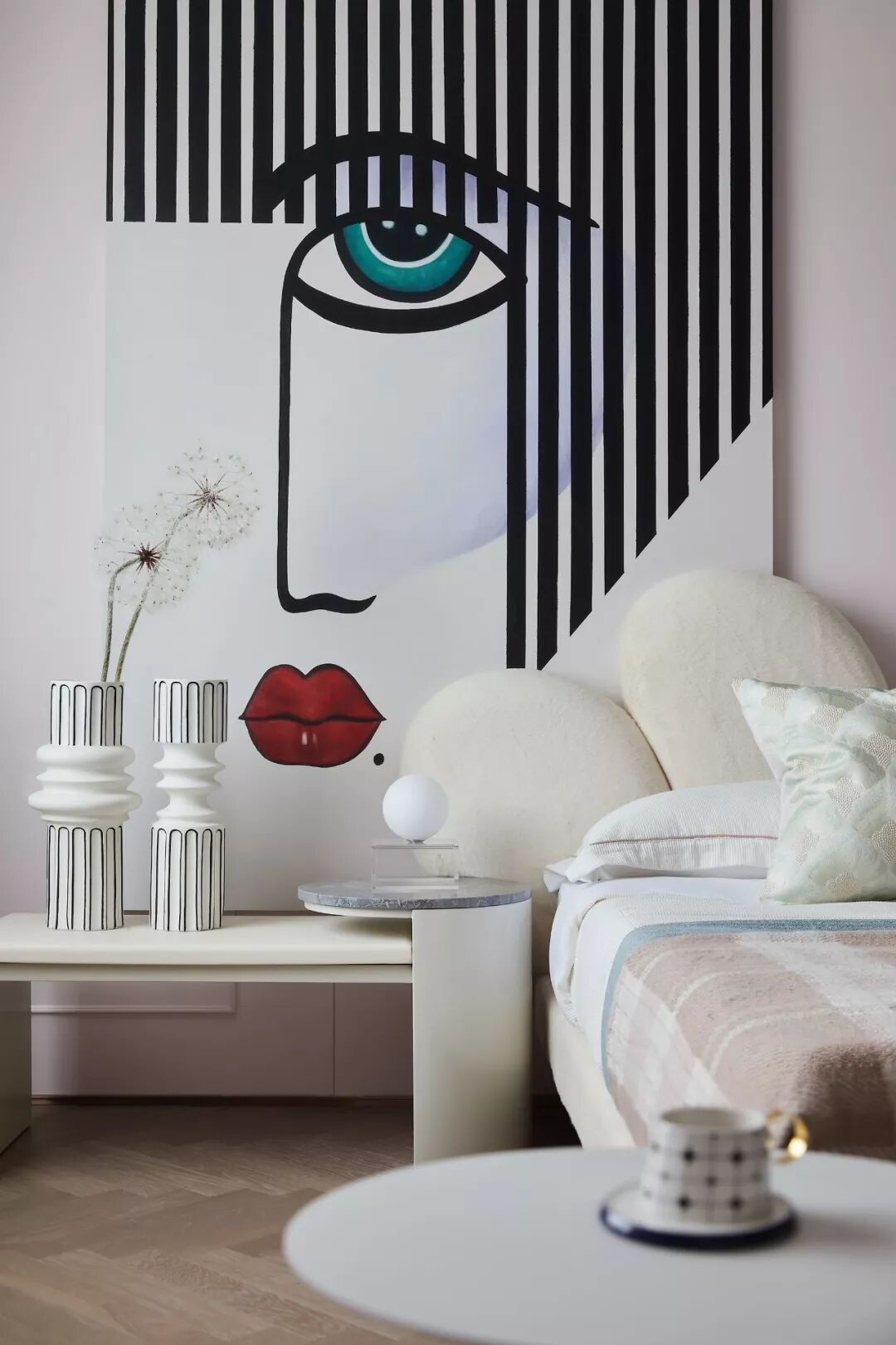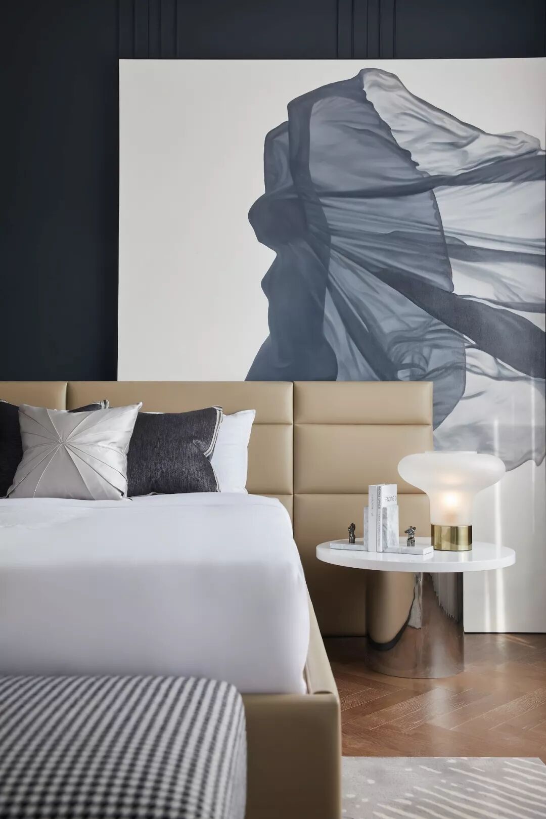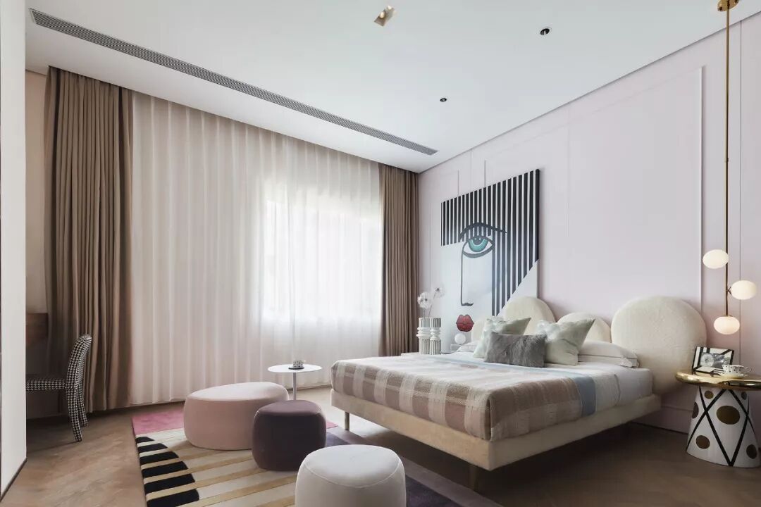 两侧床头柜,呈现方中有圆、圆中有方的组合形态,配合轻盈、神秘气质的画作,让一抹优雅回荡其间。