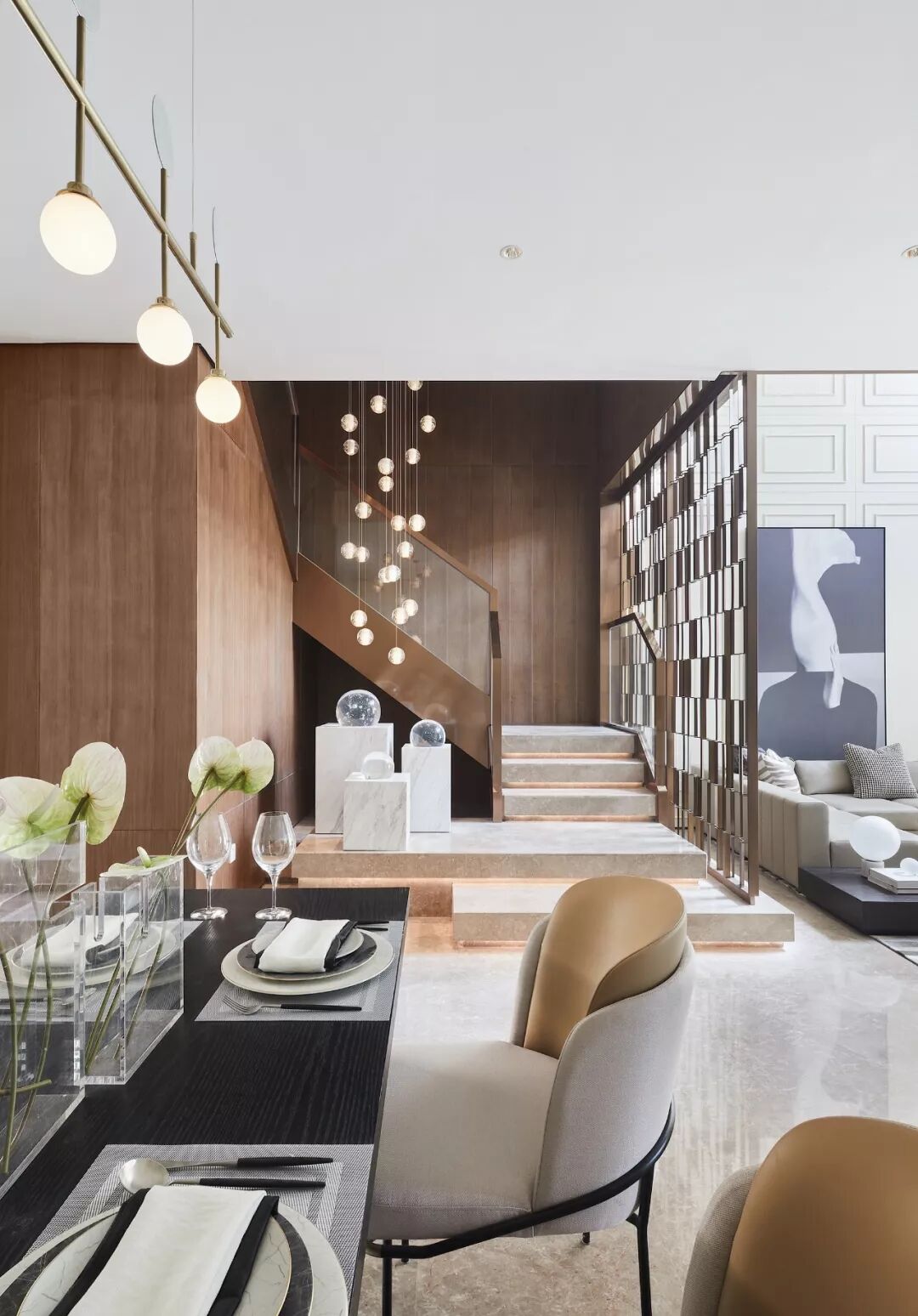 挑高6.5米的客厅,沙发后方背景线板一贯而上,透过对面的夹丝玻璃与厨房以及二楼客卧套间相望,另一侧借助半遮挡半通透的金属屏风与楼梯对话。