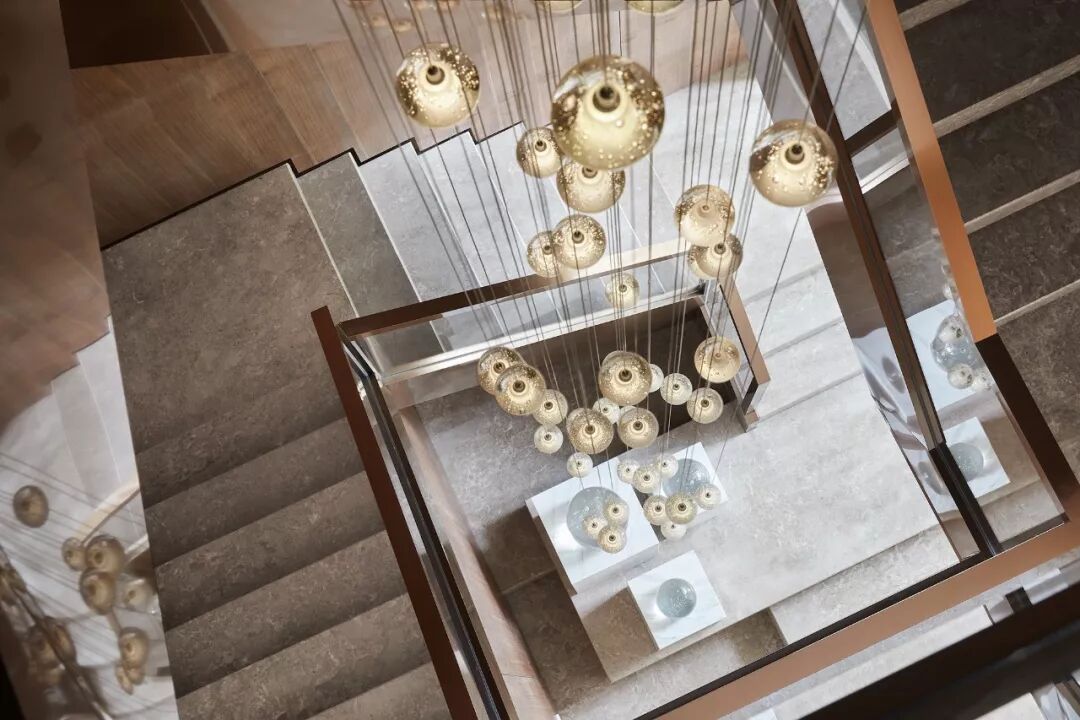 楼梯在层层递进的过渡与转折中,描绘出自由包容、生动空灵的境地。“以叠级与延伸的形态充当踏步的前奏,构成错落趣味的造景;另外凸出部分恰好为艺术装置与吊灯提供舞台,这其中也包含着我们对上下一体的呼应与考量。”方磊解释道。