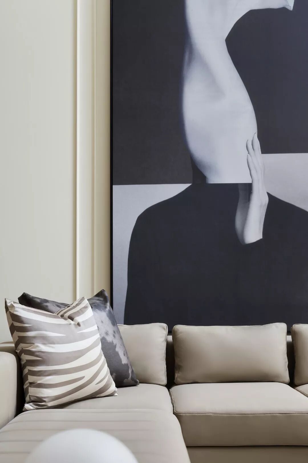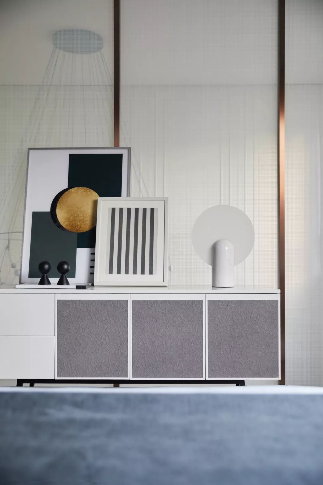 设计元素的呼应与融合在此运用娴熟:客厅两端立面的画作,均由黑白灰三色演绎,以简约的笔触勾勒艺术感知;背景线板与沙发都极具体块与线条韵律,后方非常规尺寸的画作将人的视线自然引向上方,衔接之余又散发出一种不可言说的魅力;