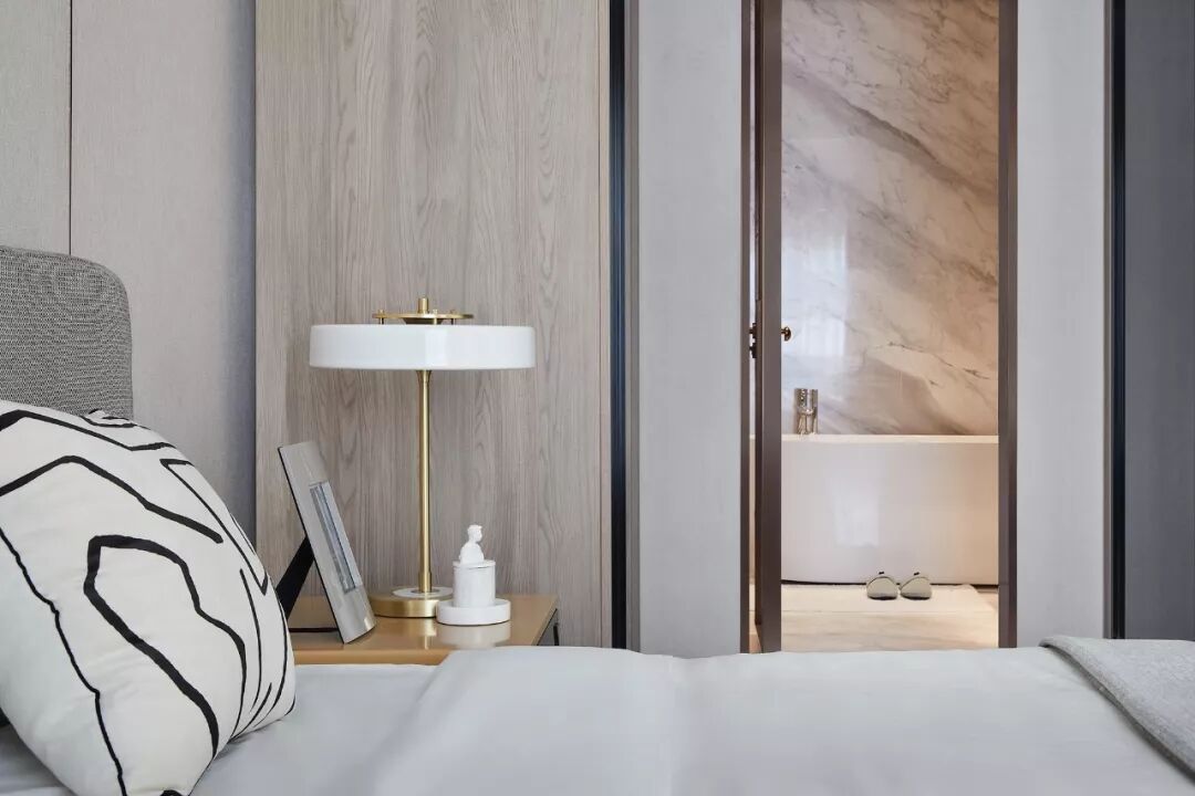 客卧套间由灰调铺陈,传达出温情而平和的情绪。通过形状、虚实、远近的合理配置,强调质感之余也不乏温馨的点缀,既显时尚新颖,又为其增添动感活力。夹丝玻璃隐约引入挑空区背景线板作为立面装饰,让舒适度与宜居感进一步提升。