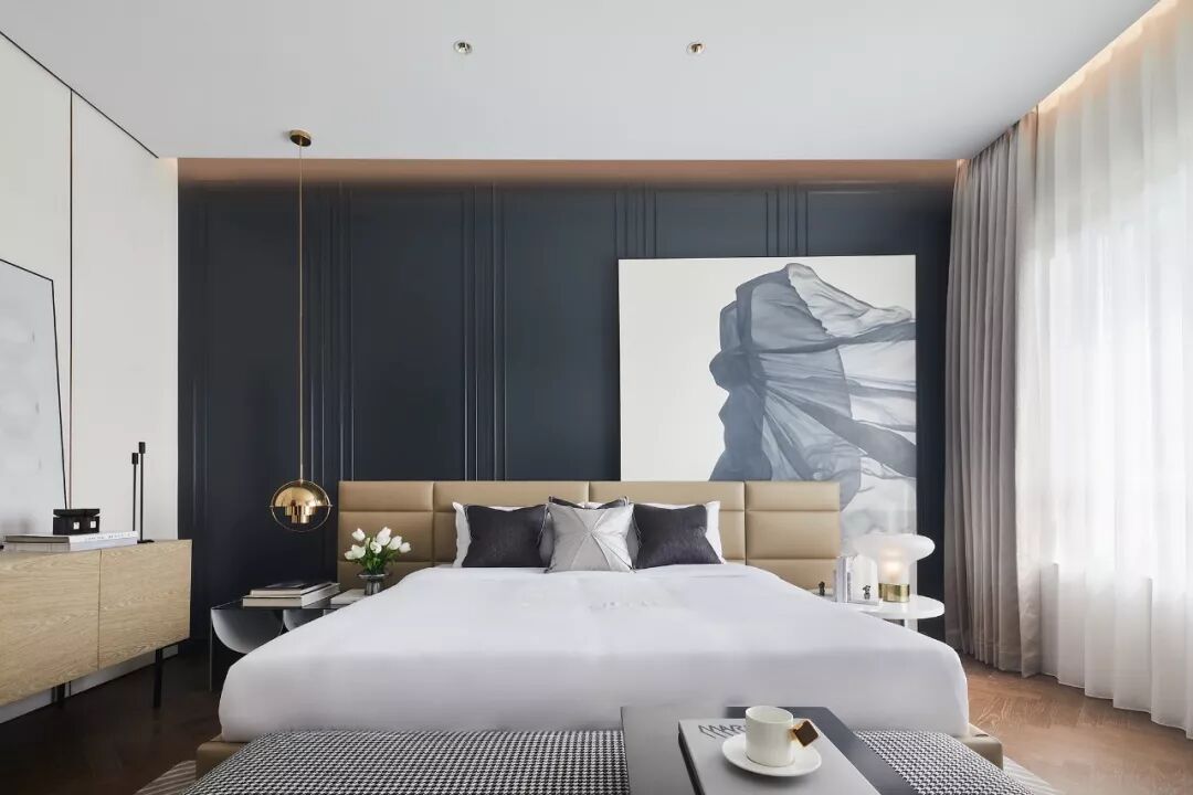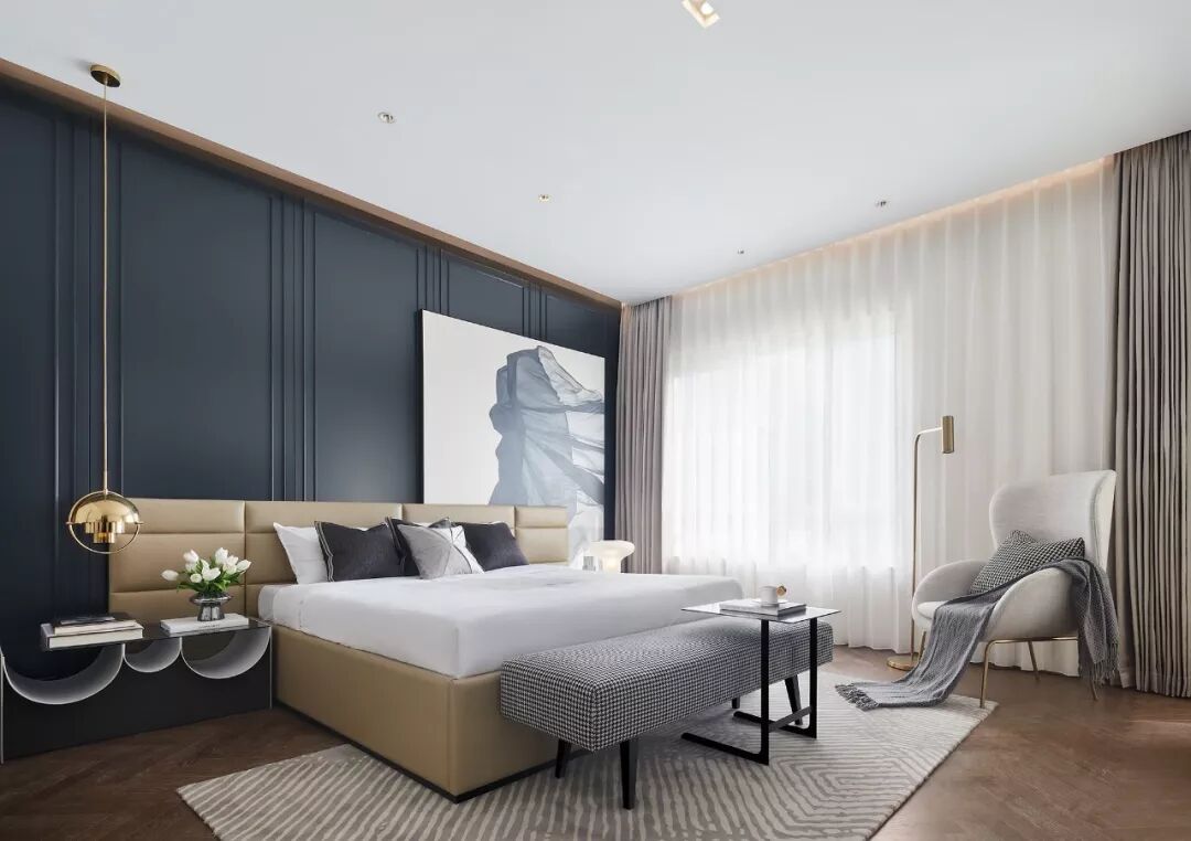 三楼主卧套间,靛蓝的背景线板,与大地色系和谐交融,烘托出自然沉稳而不失高贵的气场,又蕴藏诸多质感层次的碰撞与转换。