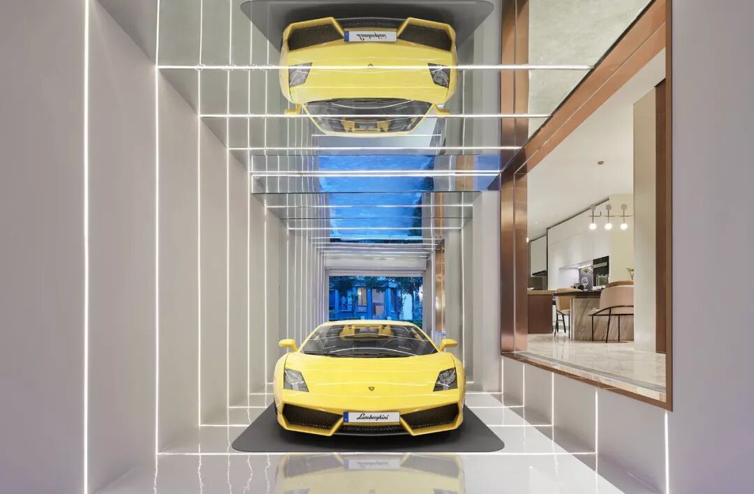 车库借由立面与顶面的镜面反射,与LED灯带一起,构筑虚实层叠与纵深扩容的效果,科技感十足。透过右侧玻璃与餐厅、过道互动,车库化身精美展厅,并成为室内颇具玩味的一景。