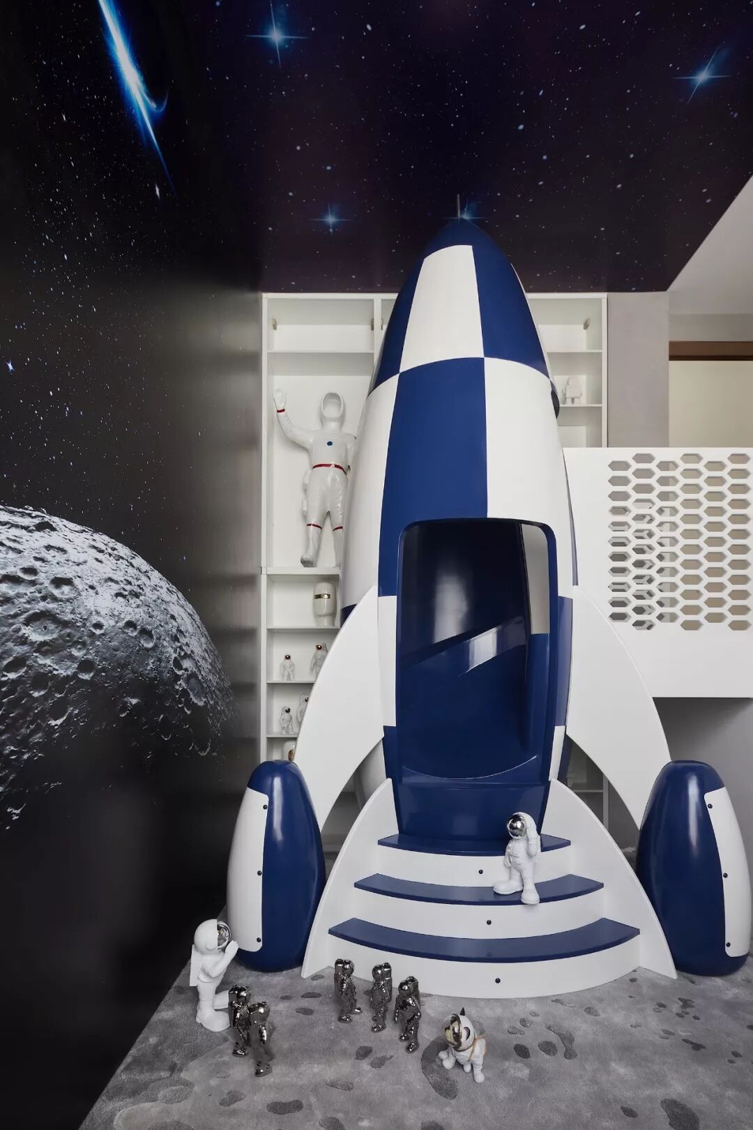 下沉式活动区可谓男孩的秘密乐园,浩瀚天际下集结的宇航员们正蓄势待发,激烈大战一触即燃。以一枚发射的火箭为枢纽,承接通往卧室的连廊,便可实现上下穿梭往来。