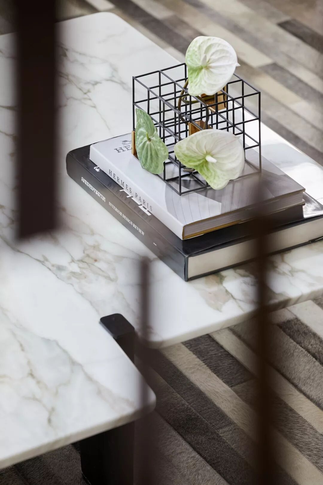 条块状金属屏风衍生的错位分割感,也在两幅画作、茶几、牛皮拼接地毯上得到体现。