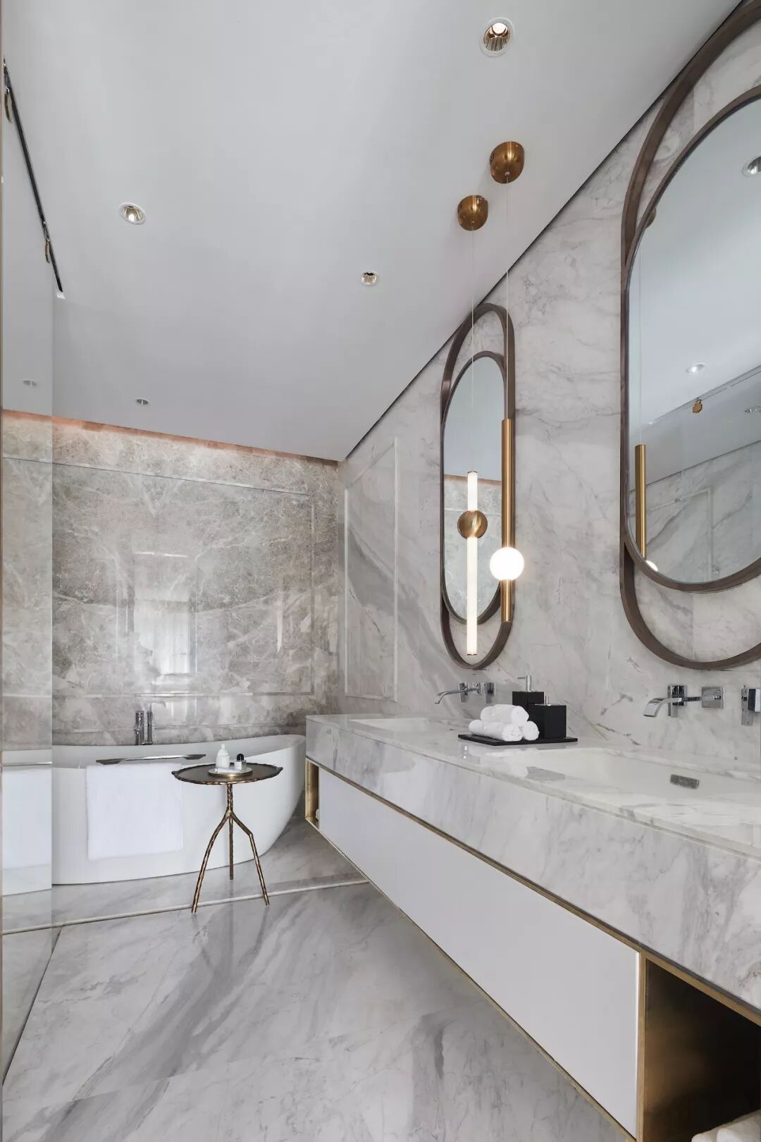 卫浴石材背景墙和一楼的线板设计如出一辙,并作造型延伸。台盆镜则近似椭圆的样式,柔化了棱角,让卫浴时刻更趋自在放松。