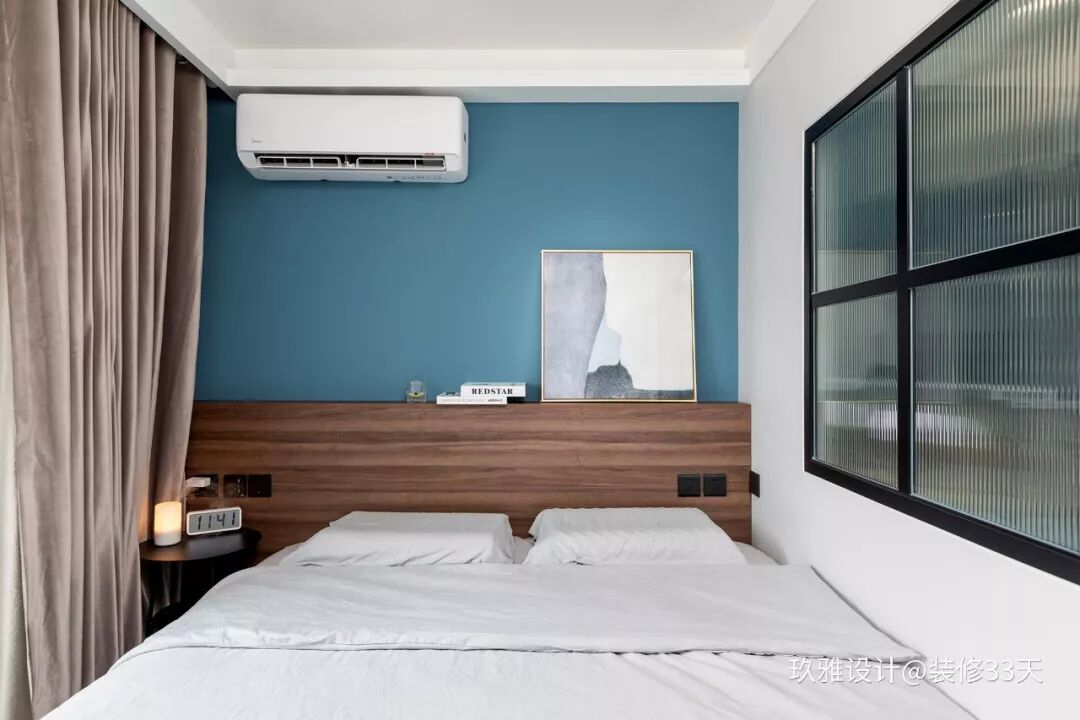 ▲ 主卧,床头背景采用与餐厅一样的蓝色系,床头背板加厚到5cm,足够放两本书和手机,背板上面留充电插座,完全取代床头柜的功能