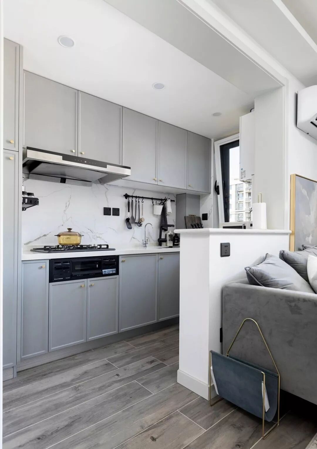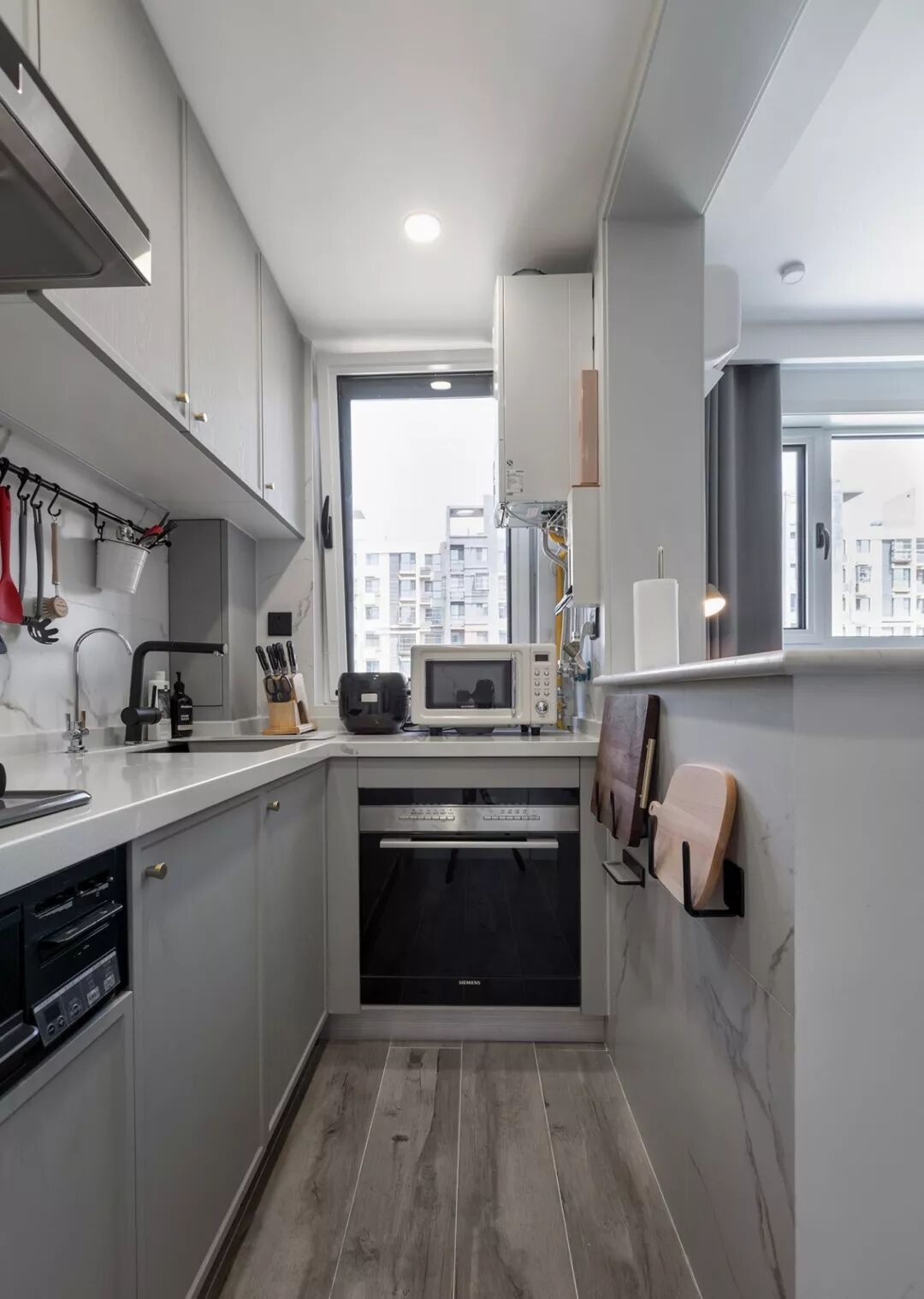 ▲ 厨房延续灰白色调,麻雀虽小,五脏俱全,还配备洗碗机,吧台下方的置物钩发挥不错的收纳功能
