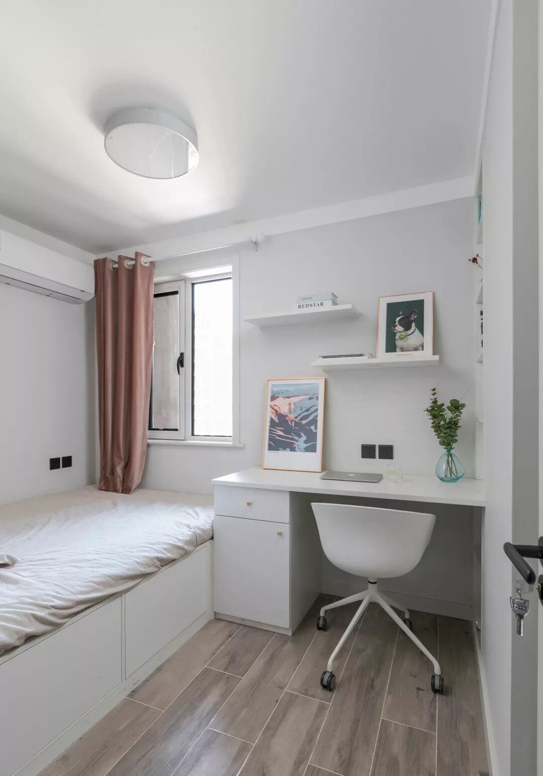 ▲ 次卧,大面积的白色调让小空间不显逼仄,靠墙设计储物床铺,安放书桌椅,利用新建墙面留出一组入墙书柜