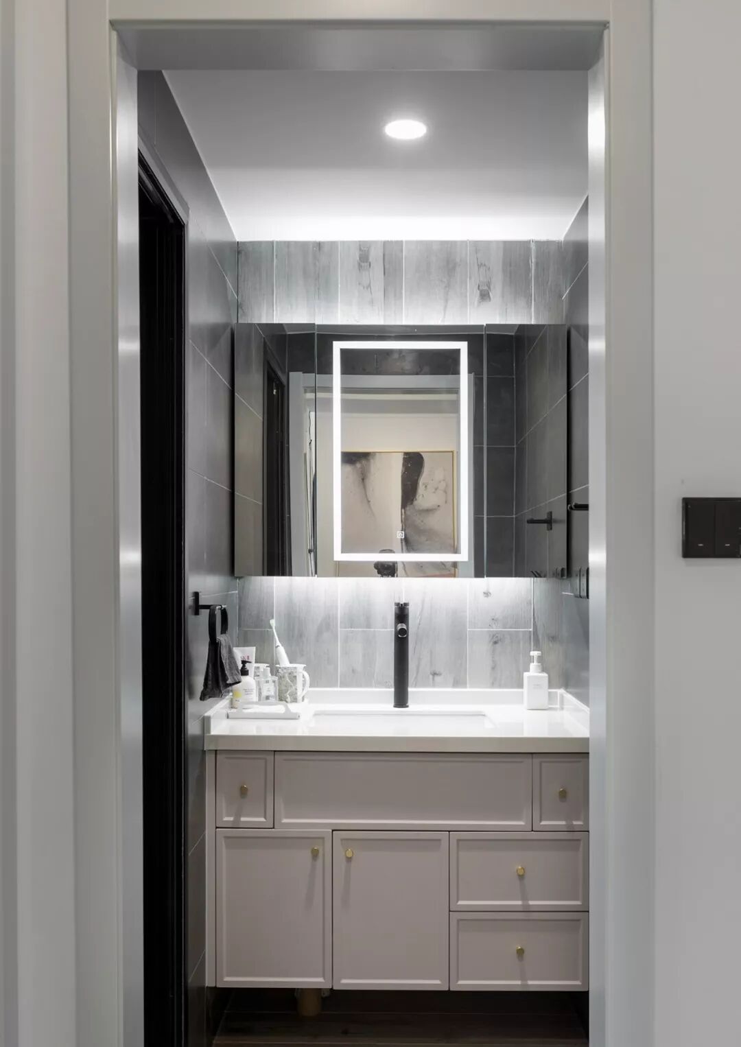 ▲ 卫生间干湿分离,提高使用效率,洗手池搭配一面收纳化妆镜,镜子背面发光,让光线增添层次感,镜面照着装饰画又是一景