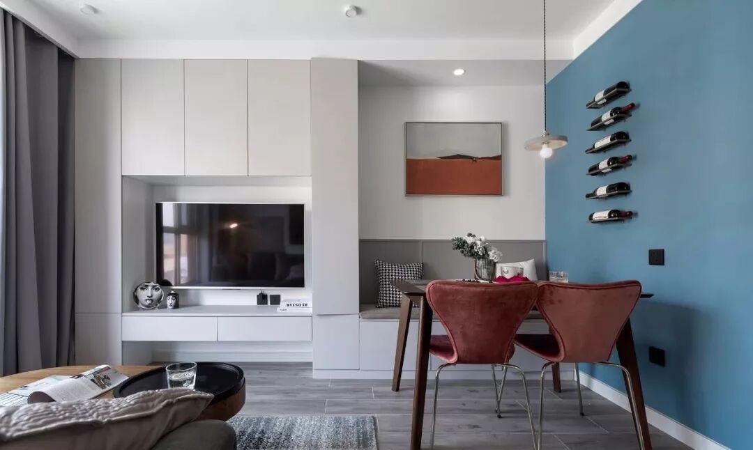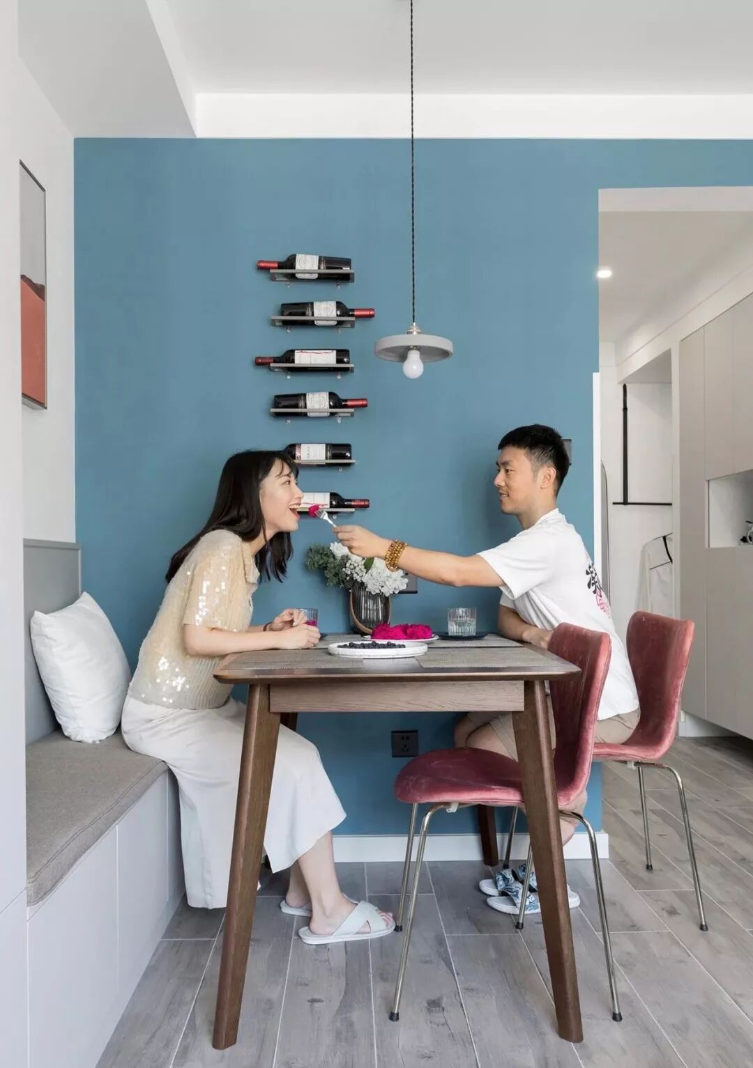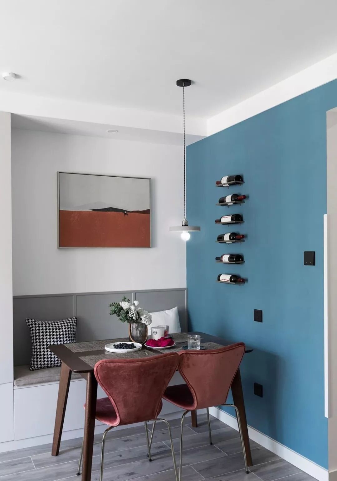 ▲ 餐厅,朱砂红色的餐椅和装饰画,搭配湖畔蓝的墙色,采用比较内敛的莫兰迪色系,不会显得过于张扬