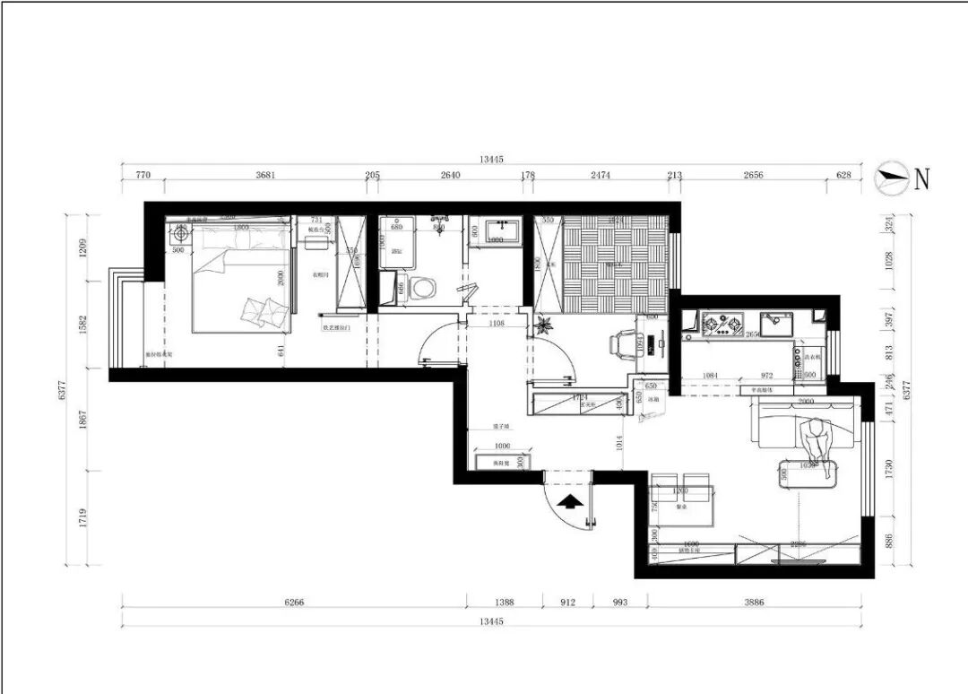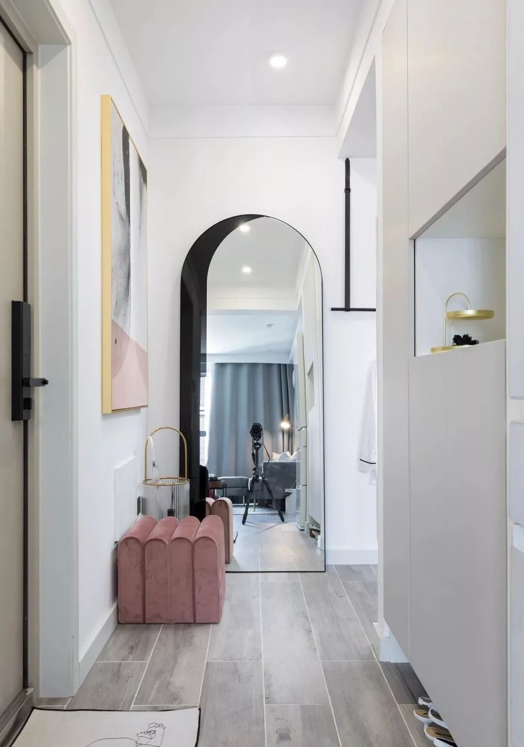 ▲ 入户正对新建的次卧外墙,S型墙内嵌一面门厅柜,长1.7米,满足门厅收纳所需,一面 Slim Archway Mirror 延伸视觉空间