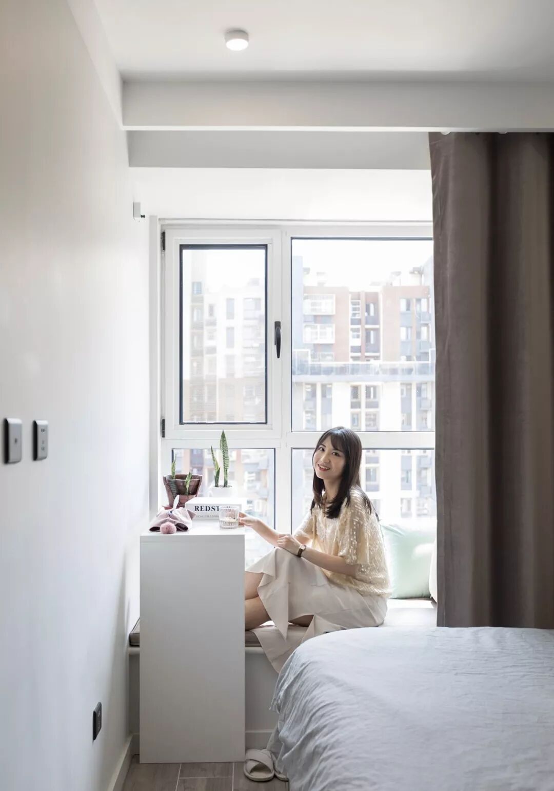 ▲ 将飘窗打造成主卧休闲一角,设计L型可移动桌子,平时可以在上面看书喝茶