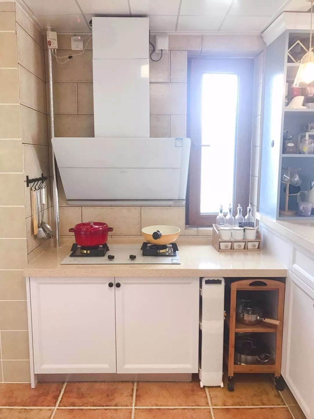 台面空间不够用的话,有些人可能会习惯移动收纳架来辅助做饭的操作,让做饭的动作更加流畅方便。