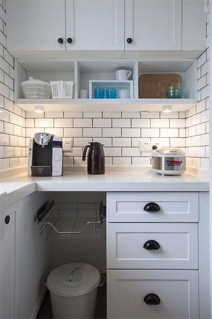 经常做饭的家庭,餐厨垃圾是非常多的,几乎每天都会满满的一桶,所以垃圾桶是必备的,而垃圾桶在厨房动线活动空间有限的情况下,就会显得碍事了,而在橱柜下留空一个位置,正好就可以成为垃圾桶的安身之所了!