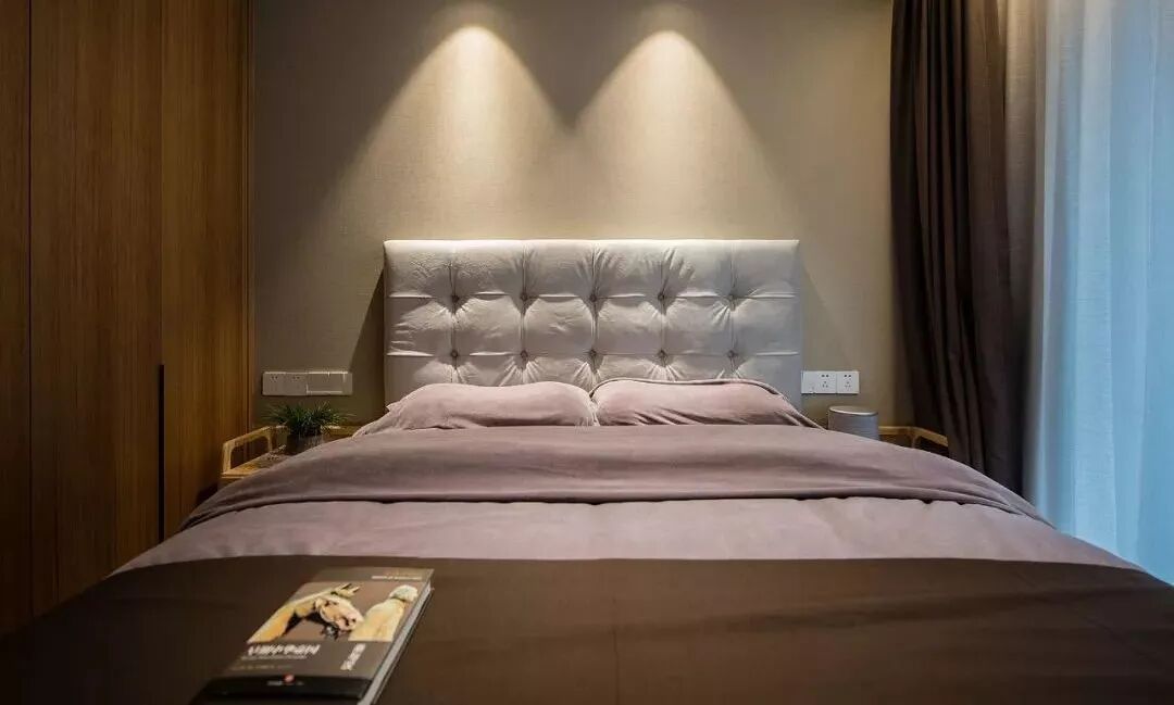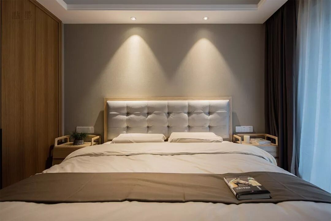主卧室的床头背景墙刷成了灰色系,在吊顶上装筒灯,带来方便阅读的光线,左右两侧对应的床头柜设计,给卧室带来了对称的美感。