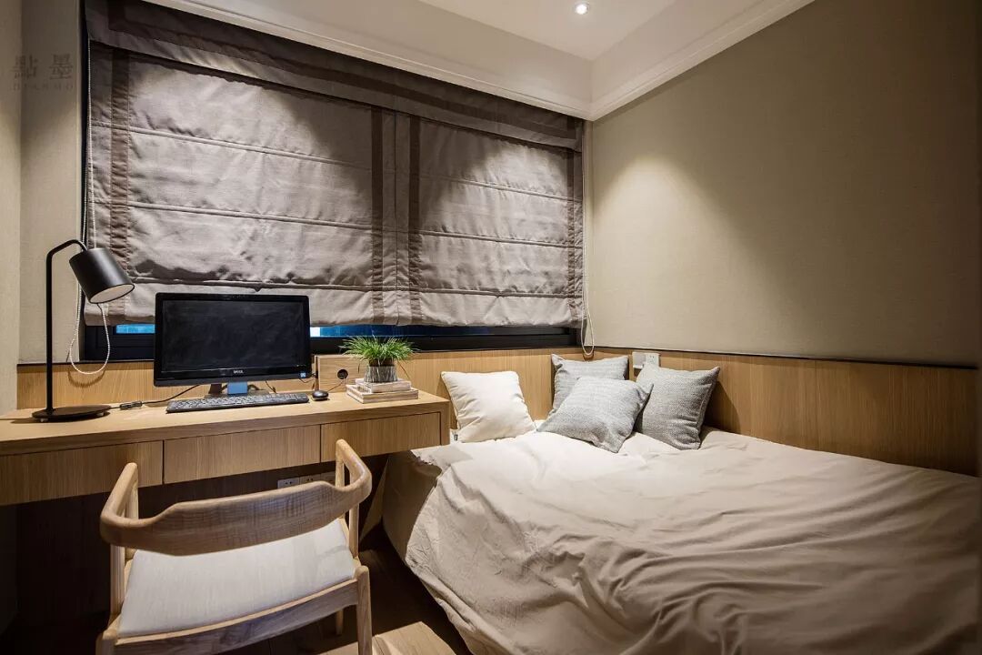 最后一间卧室是作为书房来使用,榻榻米床搭配衣柜和书桌柜的设计,满足屋主在工作之余的休憩,又能增强家里的储物能力。