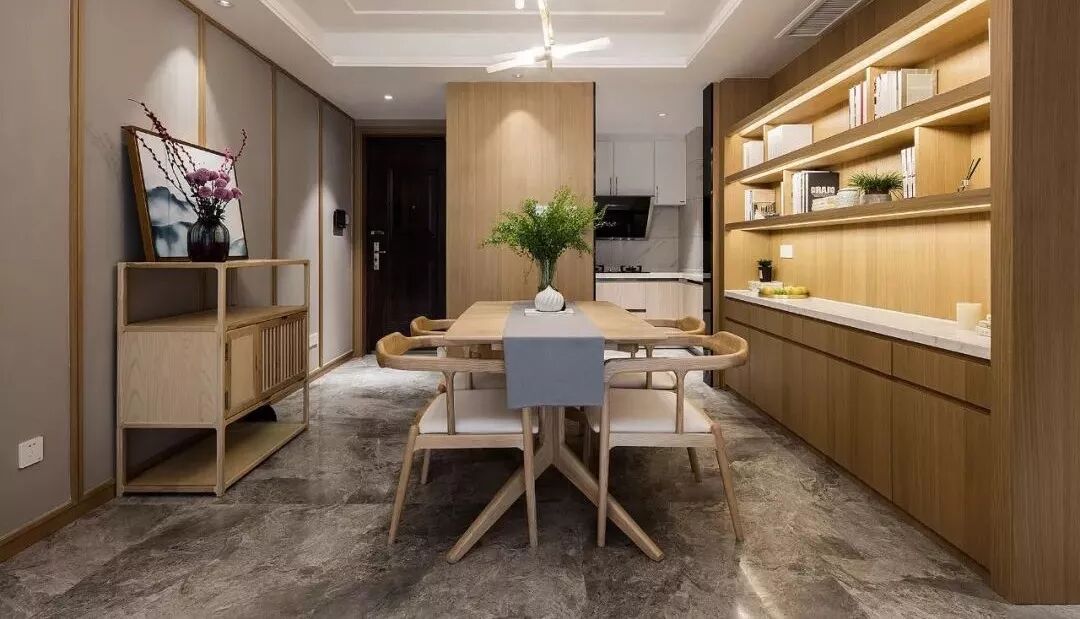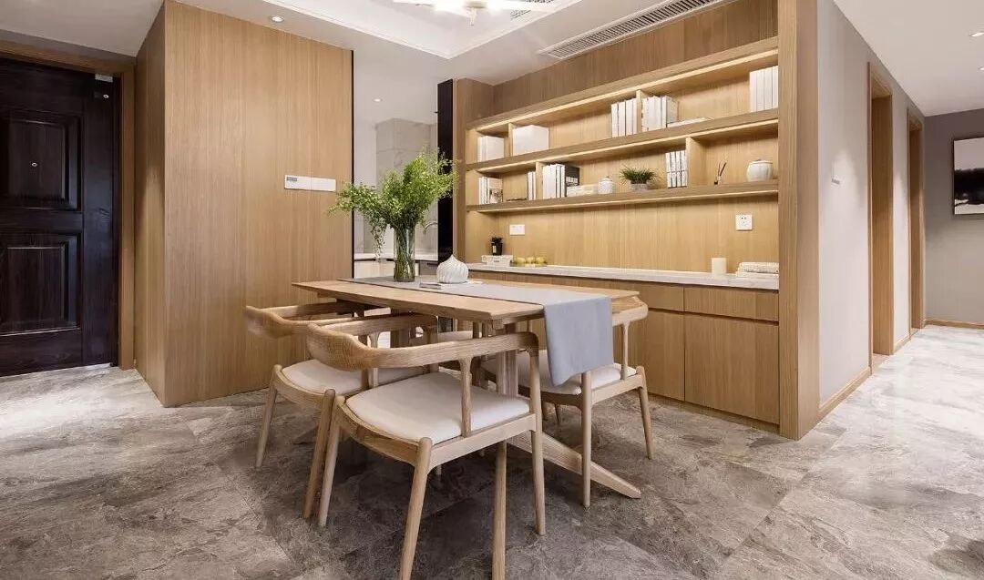 走过玄关就到了餐厅空间,原木风的餐桌椅,在餐厅的侧方还做了到顶的餐边柜,封闭式柜子和开放式搁架组合起来,再加上藏光之后非常好看。