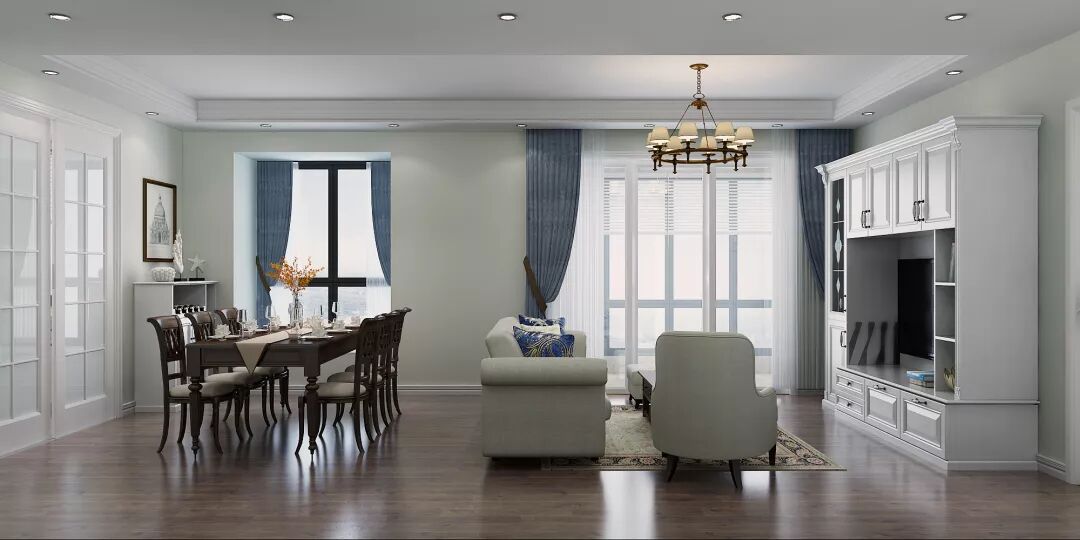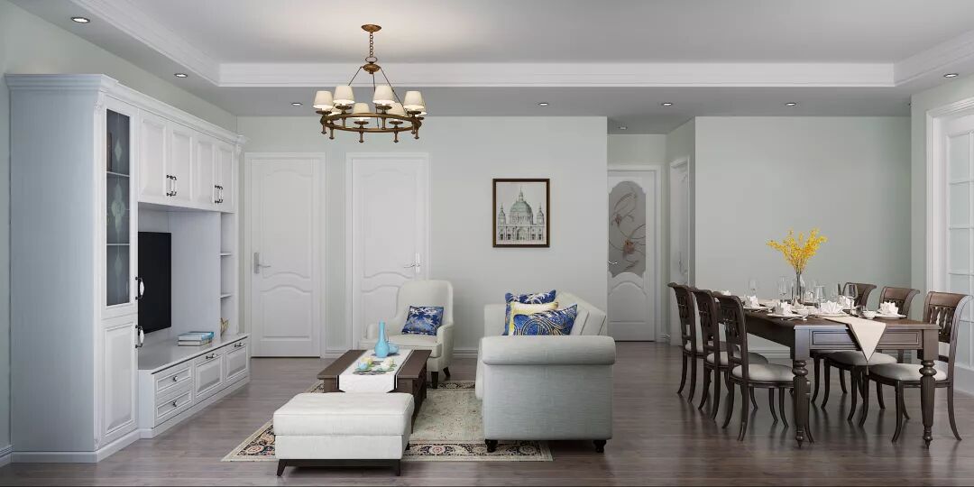 简约、浪漫的欧洲元素,带着贵族的气息融入到客餐厅的设计之中。欧式的柜体柔和又典雅,恰当地留出展示区让柜体空间显得不那么单一,柔美中又散发着一丝阳刚之气。