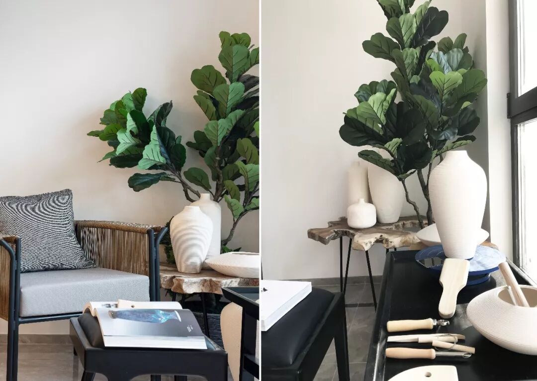 阔大的阳台,作为男主人陶艺手工作坊的空间再合适不过,充沛的光线,良好的通风,高大的实木隔断柜静静伫立着,陪伴一件件国粹艺术品的诞生。偏于一隅的休闲一角,浓浓的绿带来惬意的放松感,在黑白灰的空间主色调里,给沉静一抹秀丽的点缀。