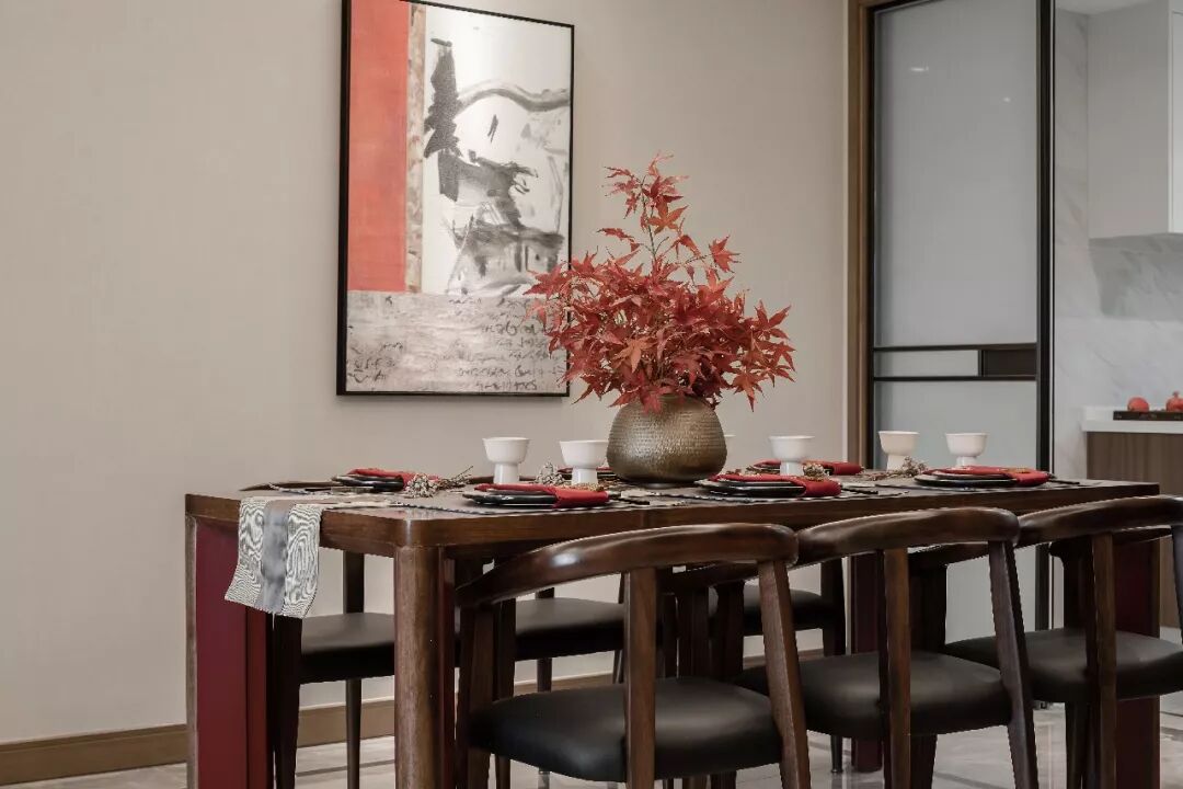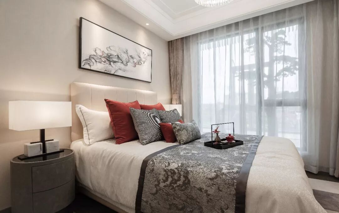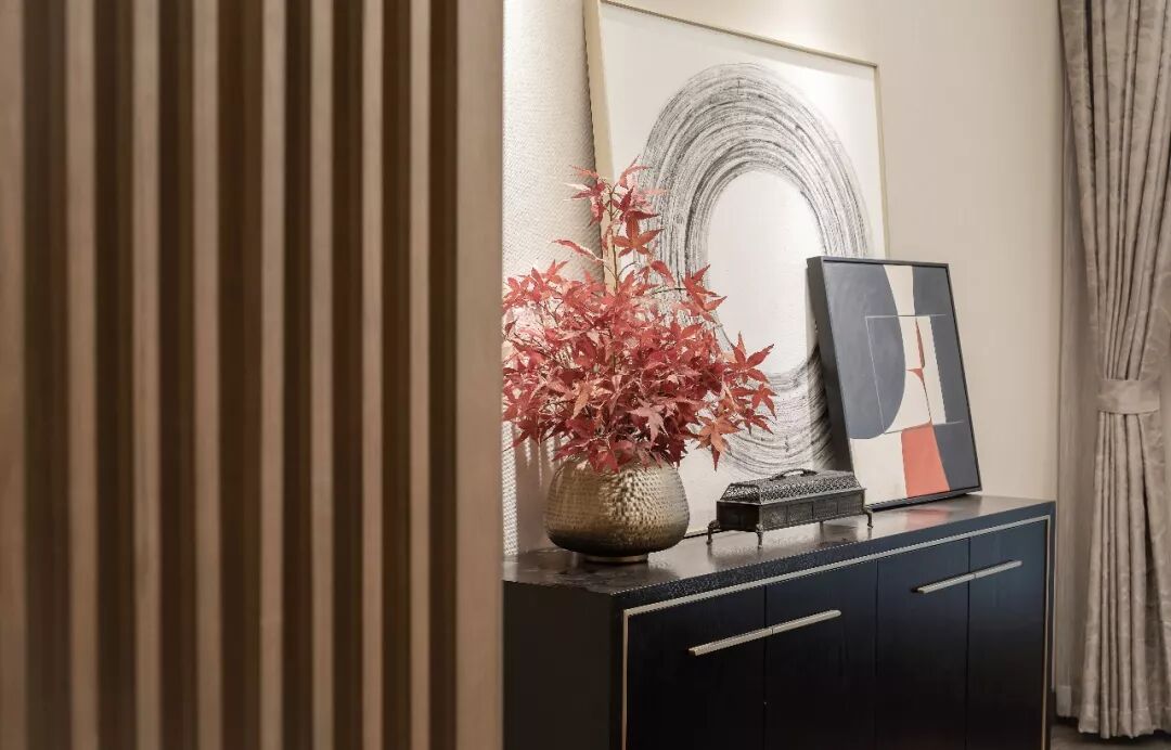 水墨画与现代艺术装置的完美结合,构成主卧背景墙丰富的质感。灵动的立体造型,像归巢燕子的呢喃,给予空间无限诗意。淡雅的高级灰色系,与丝绸的华丽光泽互相辉映,精致的黑色立柜,红的枫叶,原木色的条纹隔断,空间处处表达着一种的精神富足。原木色线条设计让视觉延伸出无限美感。简单的一簇插花,中式风格的木质小摆件,便可以弹奏出空间跃动的韵律感。