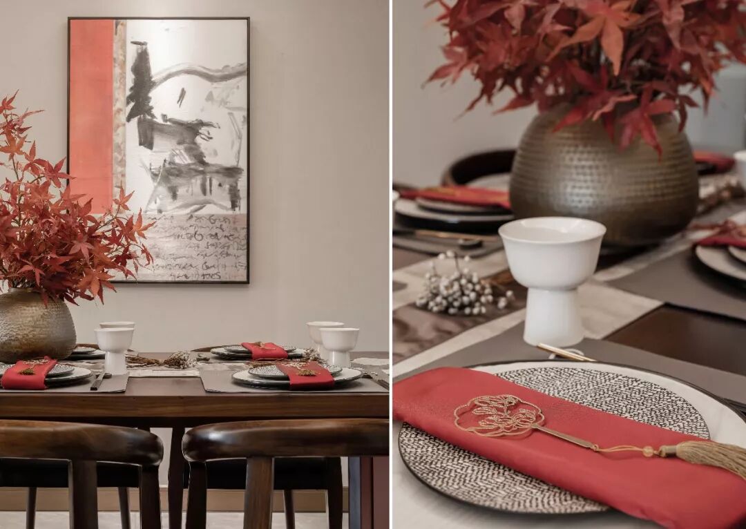 素雅的软装配饰,极具质感的材质和面料,营造出一个自然质朴的空间。极简的系列布艺,自然木色与时尚布艺结合,为空间增添更为丰富的层次与内涵。局部点缀跳跃的橘红色,以及火红的红枫主题插花,给空间增加流动的色彩与生机,一种低调中的奢华与艺术感油然而生。