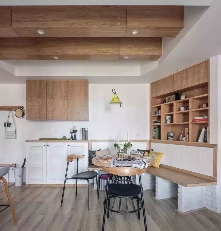 餐厅设置卡座,一体化展示柜设计,收纳、展示一面墙搞定。