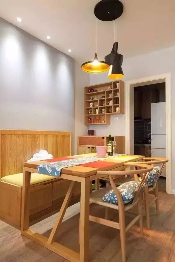 没有玄关的过渡,入门可见就是带有卡座的餐厅。卡座的加入弱化了餐桌的存在,更像是一个喝茶聊天的地方而非吃饭的场所。还是以简洁为主,墙面不需要过多的装饰,灯光的加入更是添加了温暖柔和的氛围。