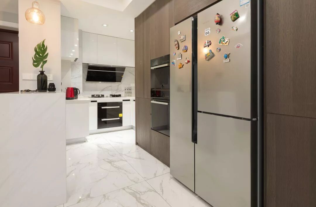 ▲开放式的厨房,墙地面铺贴雅士白瓷砖,采用白色橱柜及深灰木色的壁柜,让整个厨房看起来干净明亮又显得很有品味。