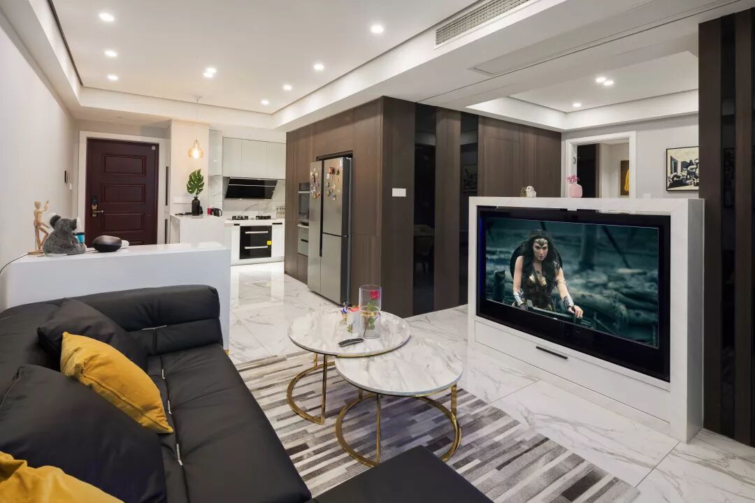 ▲半高的电视矮墙,把电视嵌入进去,视觉上看起来空间变大了不少。