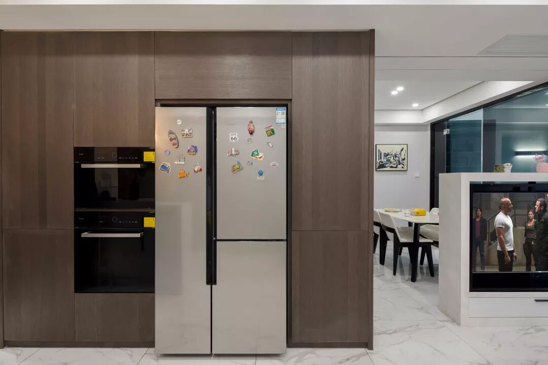 ▲放眼过去,可以看到一个大大的开放式厨房,厨房的电器都嵌入柜体,同时整墙铺贴深灰色的木饰面+黑色的玻璃,打造出一个轻奢的空间。