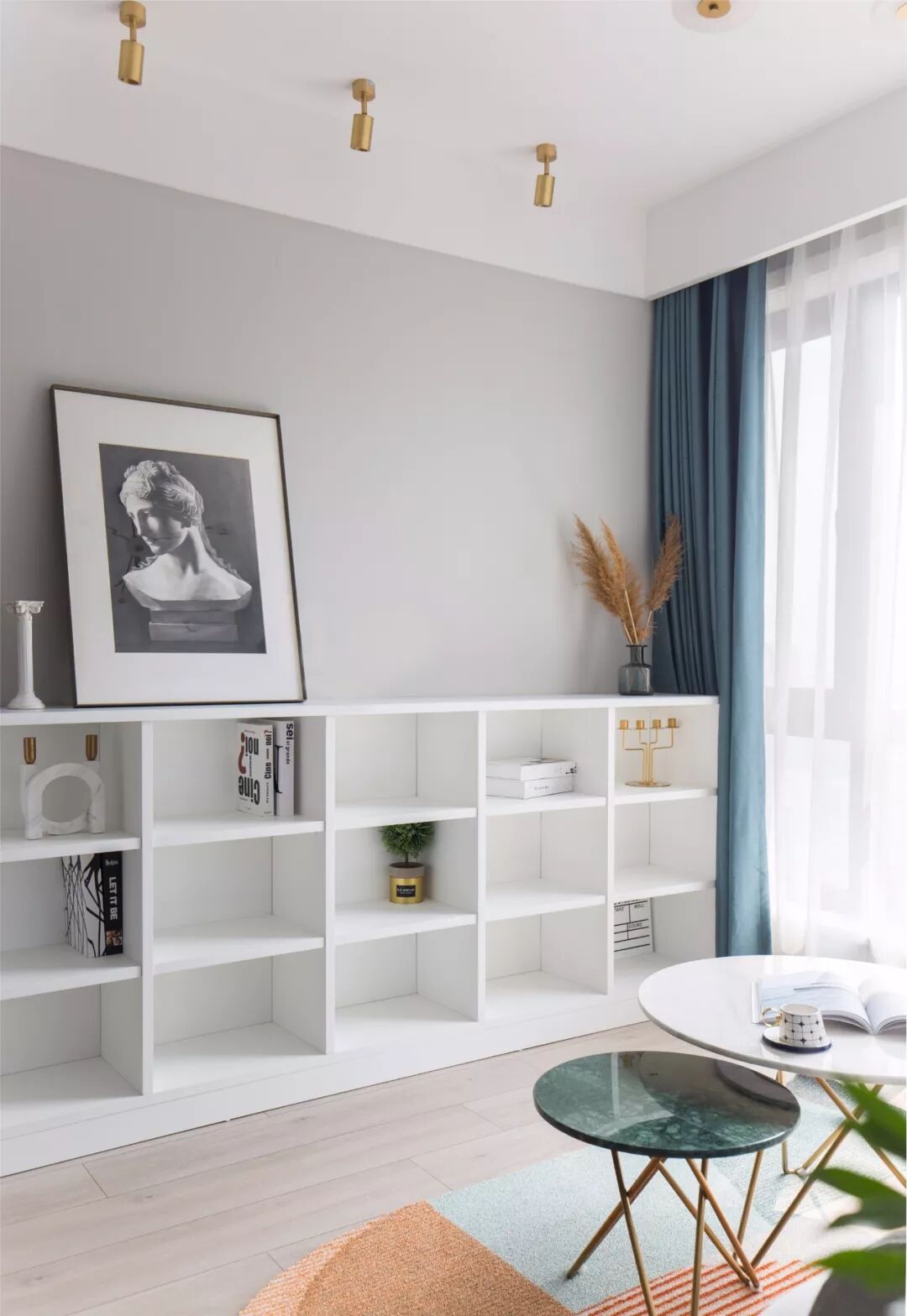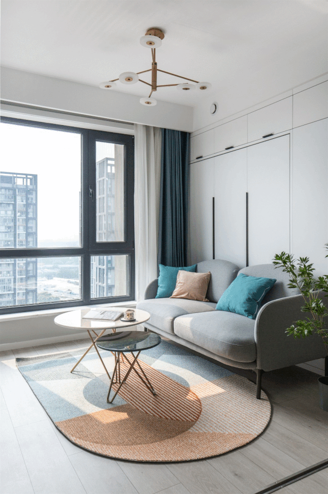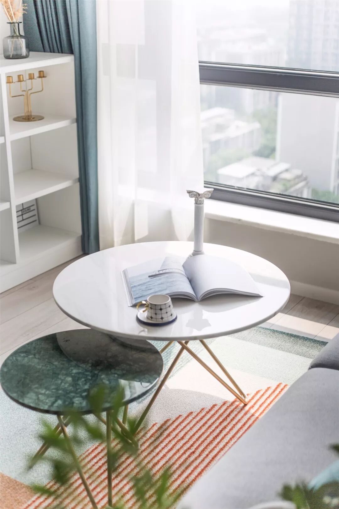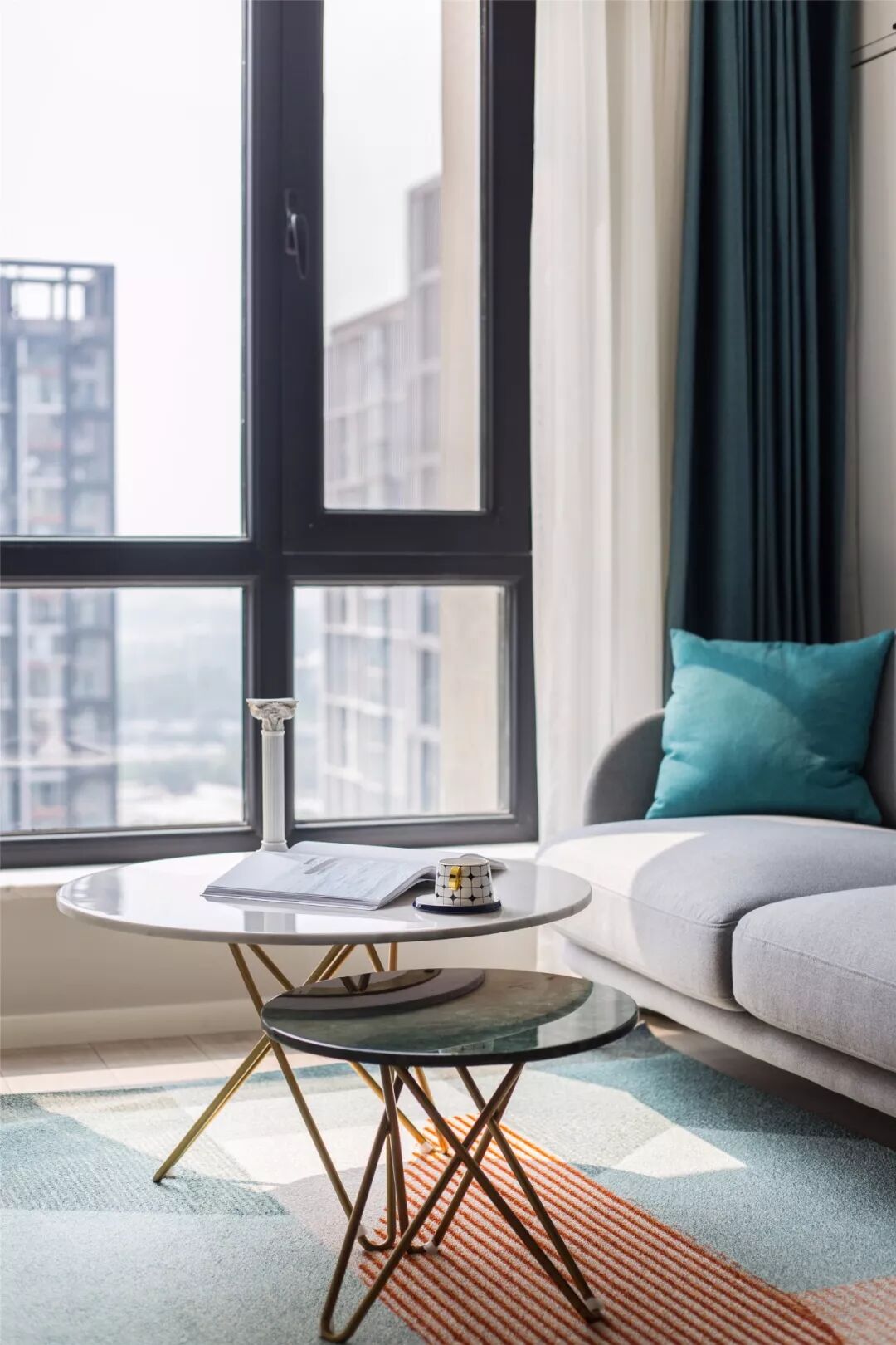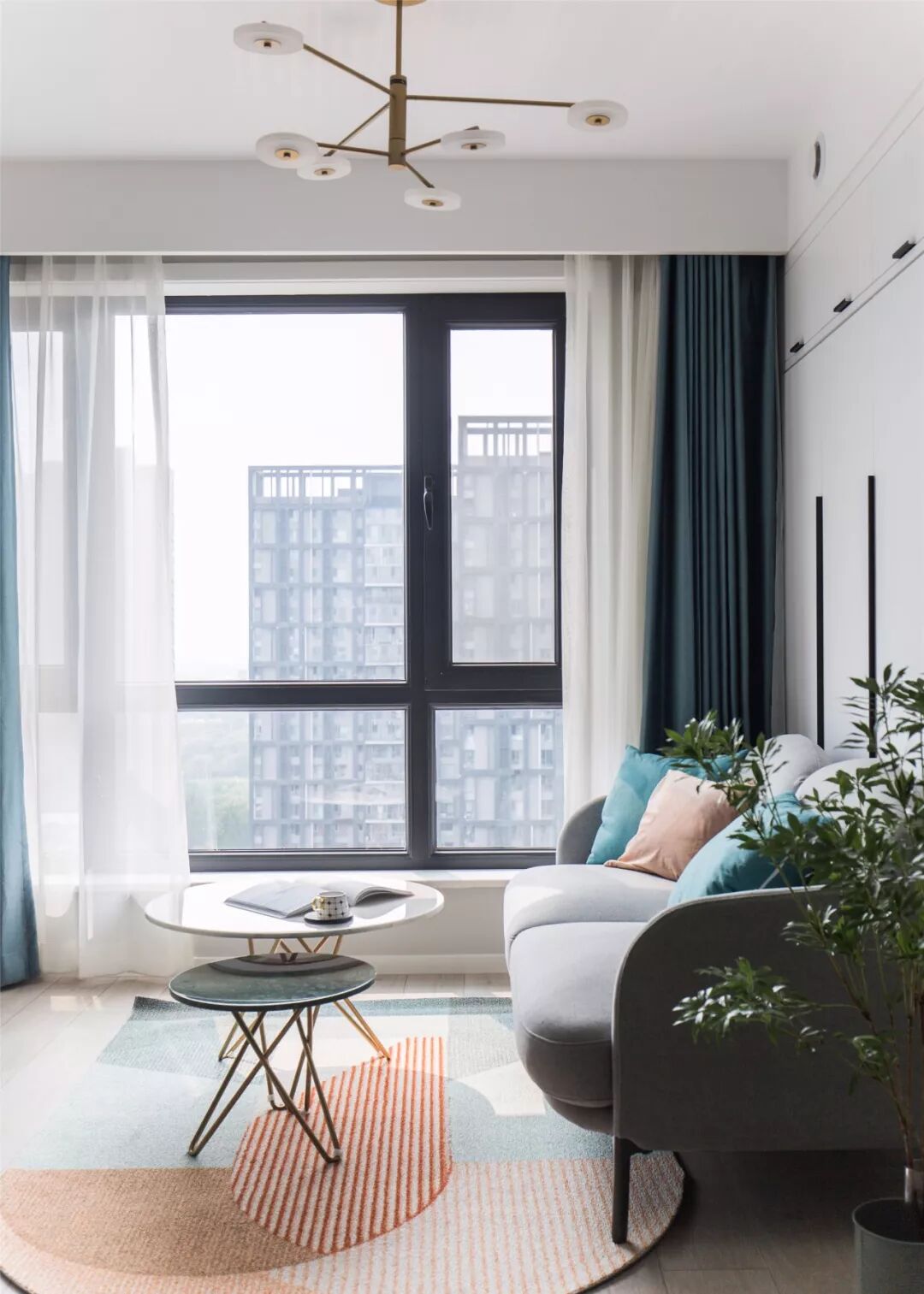 ▲北欧风的布艺沙发,搭配双拼茶几,一席简约温馨的地毯,顶上的黄铜色吊灯,整体空间都充满了舒适自然的氛围感。