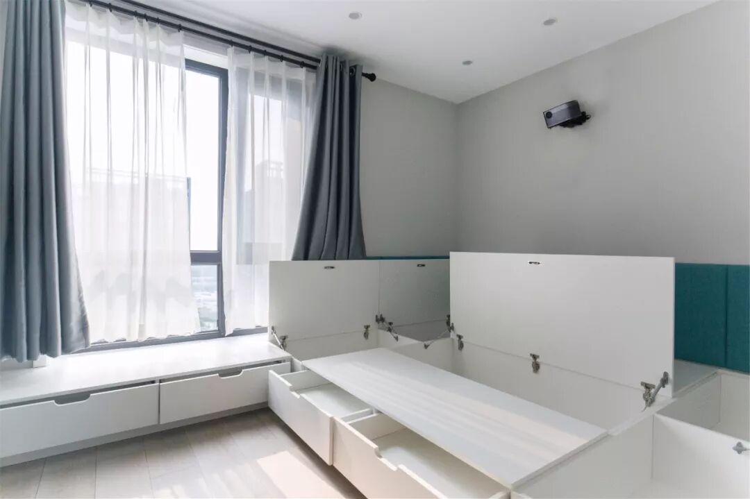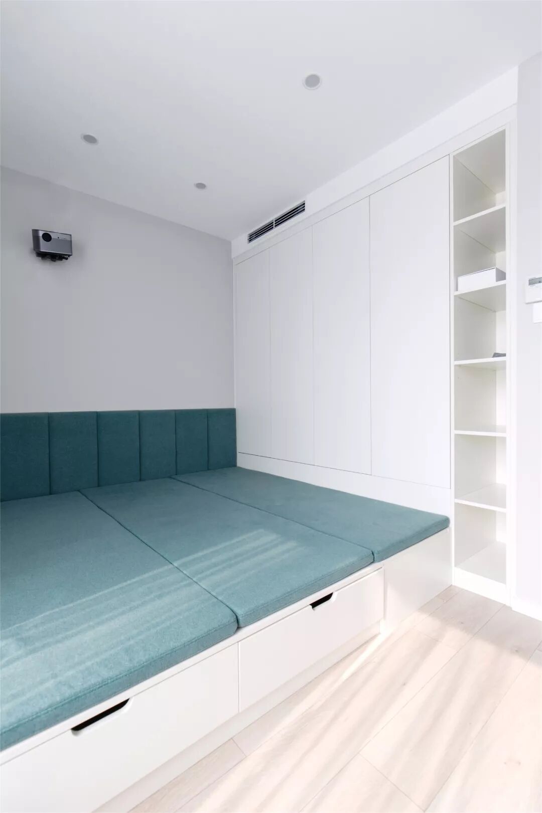 ▲卧室定制的榻榻米与窗台连成一体,让床铺空间显得更加宽敞舒适,垫上蓝色软垫,让卧室的体验轻松而又闲适,而床底区域也是丰富实用的收纳,居家的物品再多也有方便的存放位置。