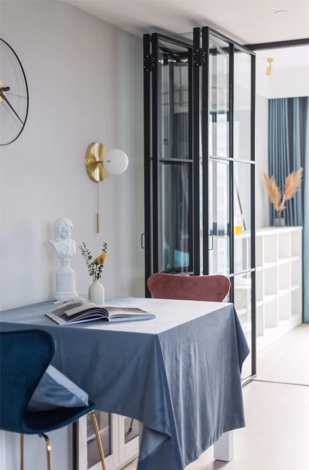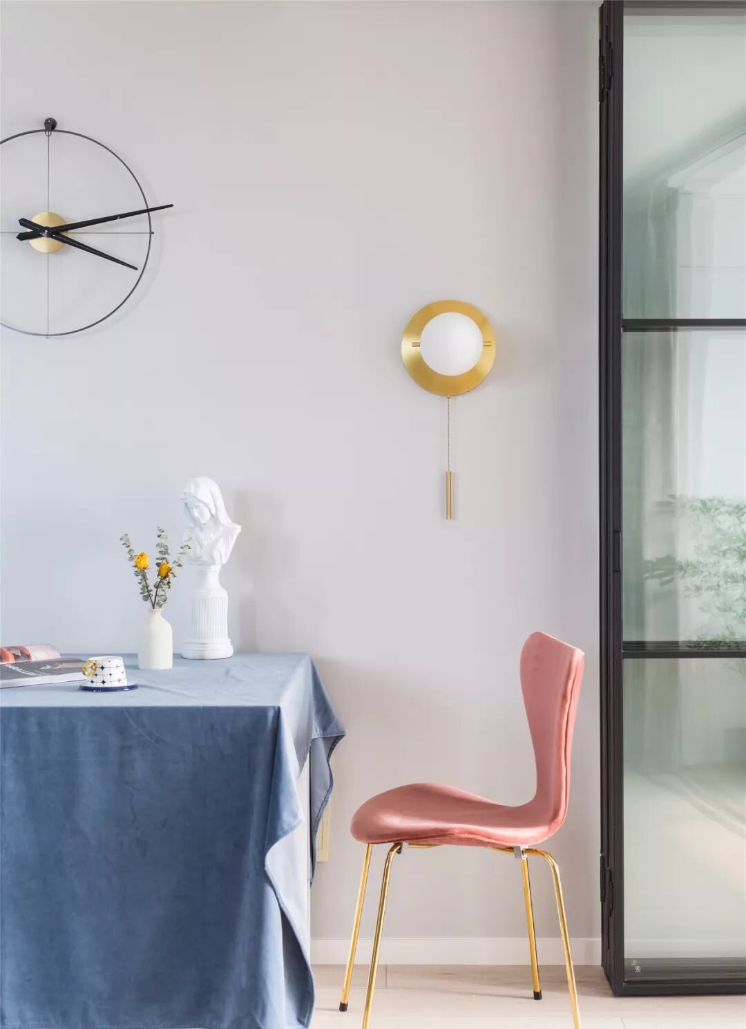 ▲餐厅在客餐厨的中间位置,一张伸缩餐桌椅,雅白的餐桌+蓝粉配的餐椅,让空间更加华丽优雅。