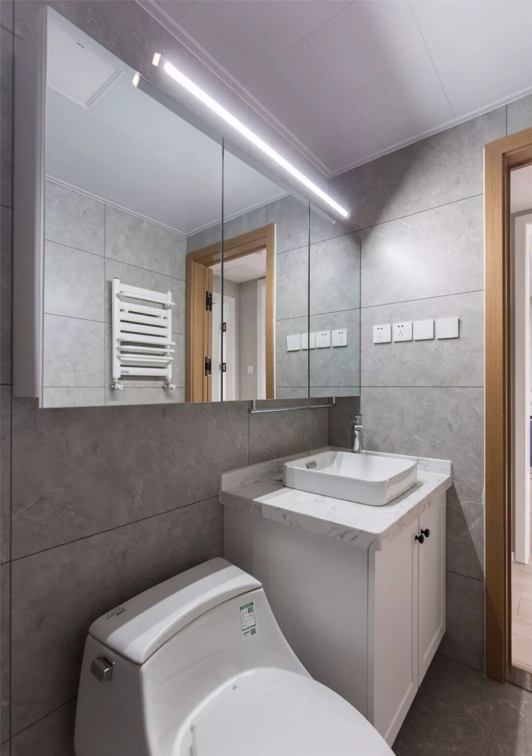 ▲卫生间以灰色调的空间基础,搭配雅白的洗手盆,呈现出一个现代时尚的空间氛围感。